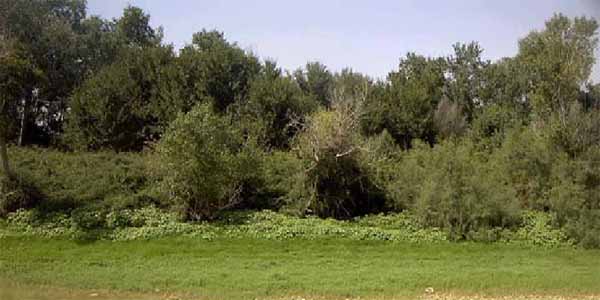 La vegetación presenta la disposición típica en grandes ríos: una primera línea de especies (sauces -Salix sp.-, tamarices -Tamarix sp.- y chopos -Populus nigra-) de porte arbustivo, no superior a 4 m, resistentes a las avenidas, que pueden estar en contacto habitual con el agua.