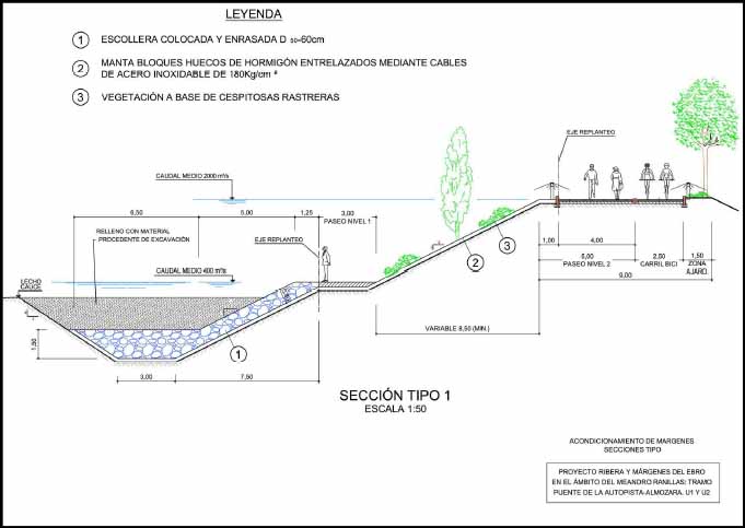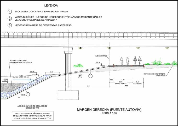 La protección del talud a lo largo de toda la margen derecha se realizará por medio de elementos denominados blandos como escolleras revegetadas y bloques de hormigón entrelazados y revegetados.