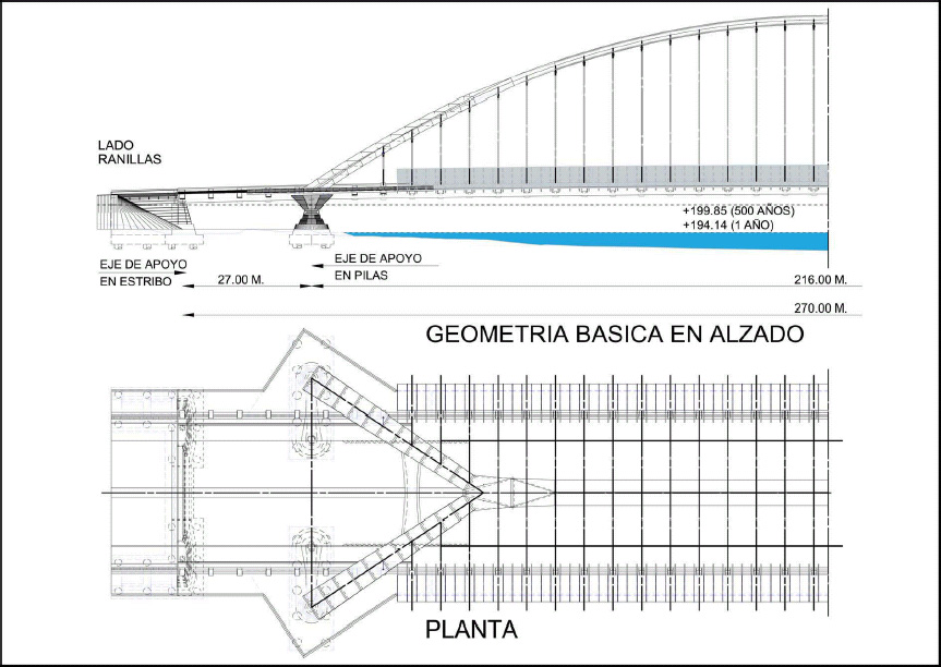 El tablero se prolonga en sendos vanos laterales de 27 metros , dando lugar a una estructura de luces 27 216 27 metros, o sea 270 metros de longitud total.