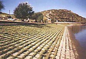 - Manto de bloques huecos de hormigón entrelazados, rellenos u ocultos por la vegetación de ribera.