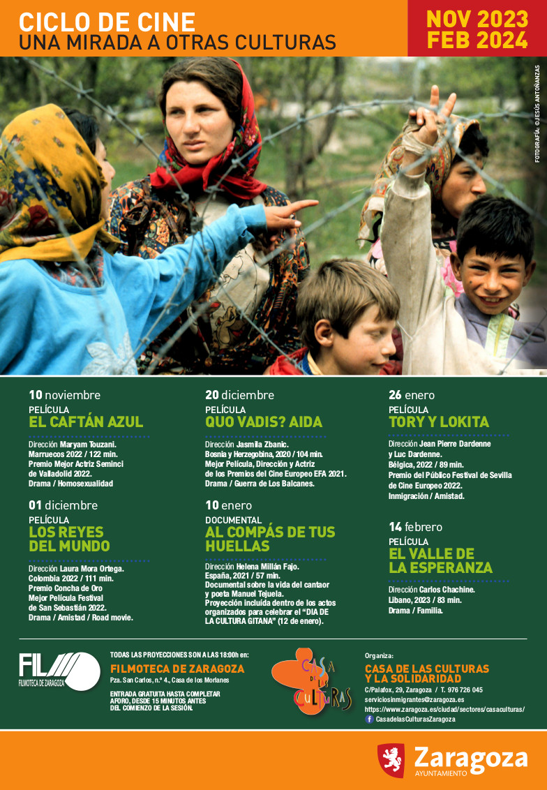 Programación de películas y documentales desde los quese abordan historias que tienen que ver con los procesos migratorios, las formas de vida y costumbres de otros pueblos, las diferencias culturales, la convivencia, la tolerancia o la no violencia... y que proporcionen una mirada abierta y tolerante a la diversidad social y cultural que nos rodea. Las proyecciones se realizan en la Filmoteca de Zaragoza entre los meses de noviembre y febrero.