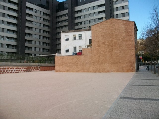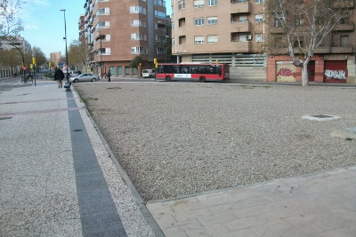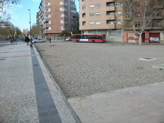 El solar ha sido acondicionado para aparcamiento, con una pequeña zona de esparcimiento. El Ayuntamiento ha procedido a la ampliación de acera, tanto en la Avenida Puente del Pilar, con una anchura aproximada de 4,5 metros, como en la calle Muel, con un anchura aproximada de 0,8 metros.