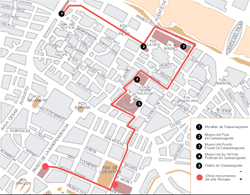 Continuar por la C/ Ramón de Cuellar, C/ Cisne, C/ Diego Dormer. Se cruza la C/ Mayor y se sigue por la C/ Refugio, se gira a la izquierda por la C/ S. Juan y San Pedro, nº 3-7 encontramos el Museo de las Termas de Caesaragusta. Su entrada está adaptada por una rampa. Para el desplazamiento a la exposición hay un elevador. Para la visita en el interior se dispone de rampa. Los espacios son reducidos para la movilidad. Hay baño adaptado. Es accesible.