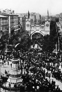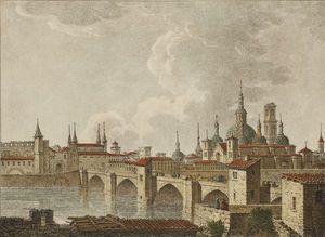 Esa majestad tan bien sentada; esa grandeza que se levanta en la imaginación y la memoria; tu nombre que es todo amor, todo sublimidad, todo gloria y heroísmo: ¡Oh ciudad! ¡Oh Zaragoza! Recíbeme en tu seno, en el cual daré al olvido cuantas grandezas me han asombrado, cuanta nobleza y dignidad se han ofrecido a mis ojos admirados. Y diciendo esto fue adelantando y llegó a los muros y quiso entrar y entró por la puerta de Santa Engracia. Penetró al Coso, y mirando que hubo esta hermosa calle, se metió por la de San Gil y atravesó la ciudad hasta el puente, desde el cual, visto el Ebro, miró hacia su lugar y le saltó el corazón pensando en su madre. Entróse en la ciudad, y viendo a la izquierda una iglesia y la puerta abierta fue allá y se encontró con el suntuoso, magnífico y soberano templo de la Seo. Volveré, dijo, que esto pide más tiempo. Y preguntando por el Pilar y oyendo que estaba cerca, visitó a Nuestra Señora y se fue a una posada. (Braulio Foz: Vida de Pedro Saputo.1844)