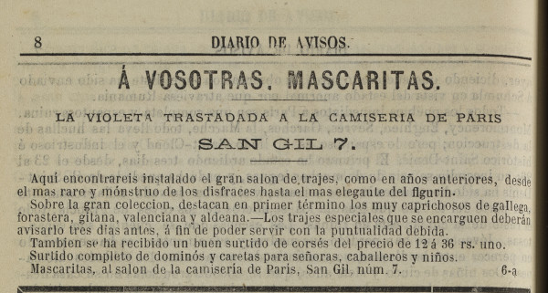 Se celebraban las carnestolendas en los días inmediatamente anteriores al miércoles de ceniza con comidas y bailes de máscaras. Los desfiles de zaragozanos disfrazados incluían chanza y crítica social para expansión y alegría popular. Ahora, igual que antes, podemos encontrar en la prensa anuncios de disfraces y programas de actos con motivo de tales fiestas.