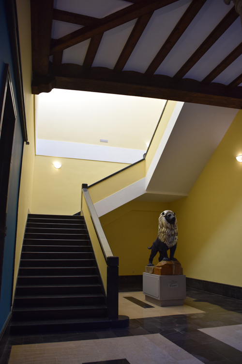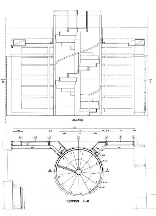Desde el patio, elemento distribuidor, se accede a las salas de exposiciones de la planta baja, y por la escalera monumental, también recuperada, a la zona de atención al público y consulta de fondos.