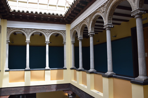 Aunque el patio solo cuenta con dos alturas (baja y primera), el palacio tiene una segunda planta donde se ubican salas de trabajo interno y uso administrativo.