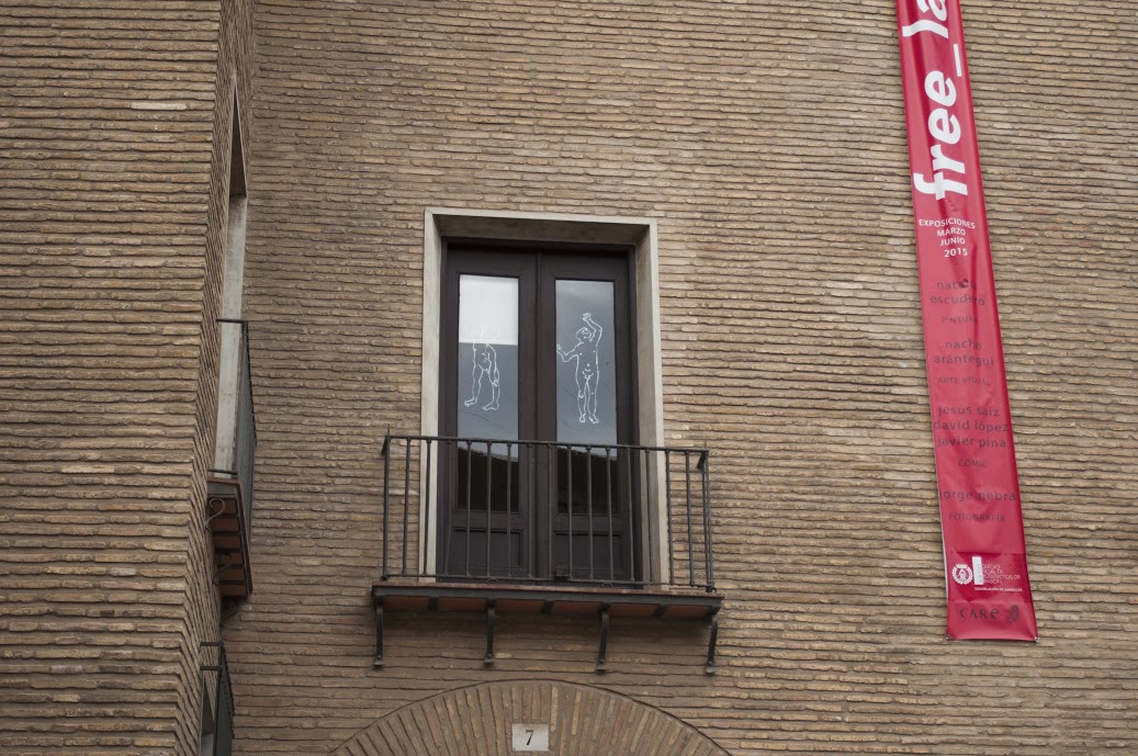 Volviendo a nuestro itinerario, llegaremos a la calle de Predicadores donde localizamos un mural realizado por la artista Eme para el Festival Asalto en su séptima edición (2012) y también de este asalto, en la calle Broqueleros, hay que señalar el trabajo de Vworkshop , un colectivo de artistas formado por Joan Tarragó y Marga López. Es en Predicadores donde se ubica el Albergue Juvenil Municipal, que en su puerta luce otra de las Intervenciones en cristales de Susana Vacas , de las mismas características que las vistas antes en las ventanas del Colegio de Arquitectos de Aragón de la Plaza Ariño, pero en este caso se trata de una sola silueta, un personaje cabeza abajo y musculoso, como en algunas de sus Intervenciones en la fachada del Teatro de las Esquinas, que sugieren la danza, el teatro o la gimnasia, actividades entre otras muchas culturales que se realizan en el interior de ese edificio.