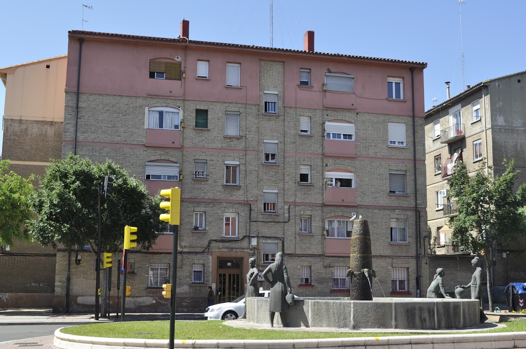 Las Fuentes es el punto de partida de este itinerario, un barrio denominado así debido a la cuantía de los manantiales y lagunas que se formaban en él como consecuencia de las crecidas del río Ebro y del río Huerva; sin embargo, paradójicamente, el distrito carecía de fuentes ornamentales hasta que gracias a una propuesta de la Asociación de Vecinos del Barrio, se ejecutó en 1980 para la rotonda de la Avenida Compromiso de Caspe, la vía principal del barrio, una fuente denominada Las Aguadoras . Un conjunto escultórico encargado al Servicio de Parques y Jardines para el que Rafael Barnola realizó un boceto, asimismo, se pusieron en contacto con Enrique Galcera, quien pasó el encargo a su mujer, la escultora catalana Luisa Granero Sierra . Se trata de una fuente circular en piedra, de cuyo centro emerge un pilón con cabezas de carnero y alrededor se encuentran cuatro figuras femeninas: las aguadoras, tres de las cuales están de pie portando cántaros y la cuarta se sienta sobre la fuente. Son figuras sencillas y de formas redondeadas que visten ropas ligeras, derivadas de la tradición escultórica catalana. Siendo una pieza de arte público realizada en Zaragoza por una escultora, también hay que destacar que el tema es femenino, remitiéndonos a una actividad propia de las mujeres en un pasado no tan lejano, haciendo que esto no caiga en el olvido. No se trata de personajes individuales concretos, pues casi cabría definirlas como figuras alegóricas. Bien se las podría poner en relación con la Alegoría a la Agricultura de la artista zaragozana Dolores Franco Secorun , una escultura de 1962 que representa una mujer de formas consistentes en actitud pensativa, sentada sobre unas rocas, combinando naturalismo y clasicismo, sin ninguno de los atributos iconográficos relacionados con la actividad agrícola desde la Antigüedad Clásica, como pueden ser arbustos, frutos o instrumentos del oficio. Pero sobre todo la comparación casi inevitable, como monumento icónico de todo un barrio zaragozano, es el Monumento a la Paz de Francisca Abreu , muy próximo en cronología a la Fuente de las Aguadoras, aunque lejos de nuestro recorrido ya que se encuentra en el Barrio de la Paz, al que intentaba simbolizar ese monumento de carácter tan abstracto.
