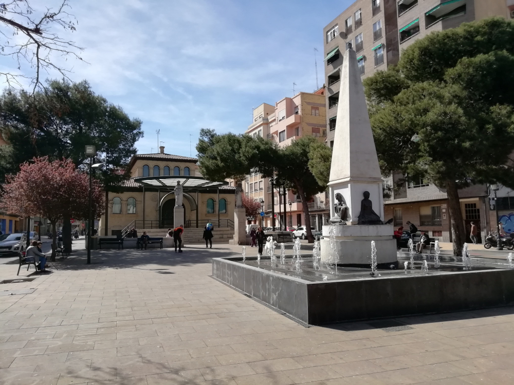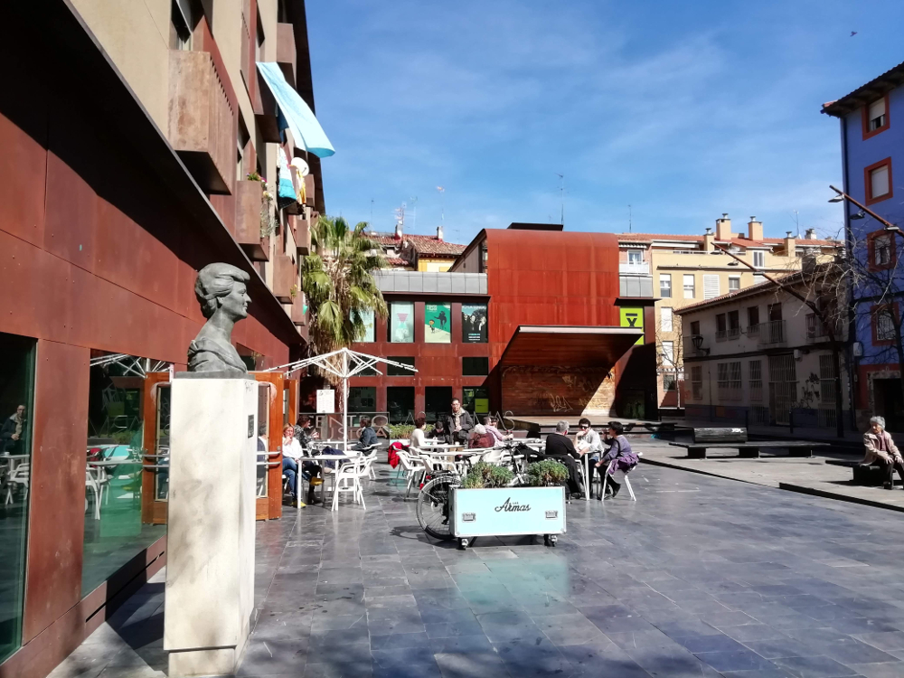 Nuestro siguiente destino es otra obra del mismo escultor que encontraremos cruzando al otro lado de la Avenida César Augusto siguiendo por la calle Las Armas, más allá del número 32, donde hay una sede de la Escuela Municipal de Música y Danza, hasta llegar al impresionante Centro Musical y Artístico Las Armas , que tiene salas para ensayos, grabaciones y conciertos pero también un escenario al aire libre en la plaza Mariano de Cavia. Allí encontraremos el Monumento a Pilar Lorengar , un retrato de busto hecho por Manuel Arcón que originalmente estuvo en el Auditorio, pero en 2011 fue inaugurado en este otro emplazamiento. Muy apropiadamente, porque la famosa soprano nació en este barrio de San Pablo o del Gancho, zona depauperada que por entonces se pretendía revitalizar como “barrio artístico” especialmente con apuestas muy variadas relacionadas con la música. De hecho, detrás del flamante centro musical ya citado se construyó una manzana de casas para vivienda social cuyos bajos reservó la concejalía de cultura para talleres de artistas y artesanos, animando muy especialmente a que se instalaran en ellos u otros espacios aledaños los fabricantes de instrumentos musicales –aún hay unos luthiers en el vecindario–.