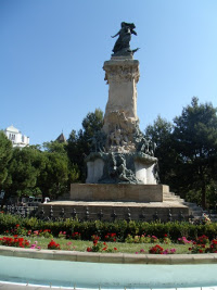 Desde la Glorieta de Sasera nos trasladamos por el Paseo de la Constitución hacia la Plaza de los Sitios. Este paseo que hoy recibe un nombre tan democrático fue conocido durante el periodo franquista como Paseo de Marina Moreno. En esta vía el boulevard central, entre la vegetación, está recorrido por varias esculturas, pero ninguna de ellas hace referencia a los Sitios.
