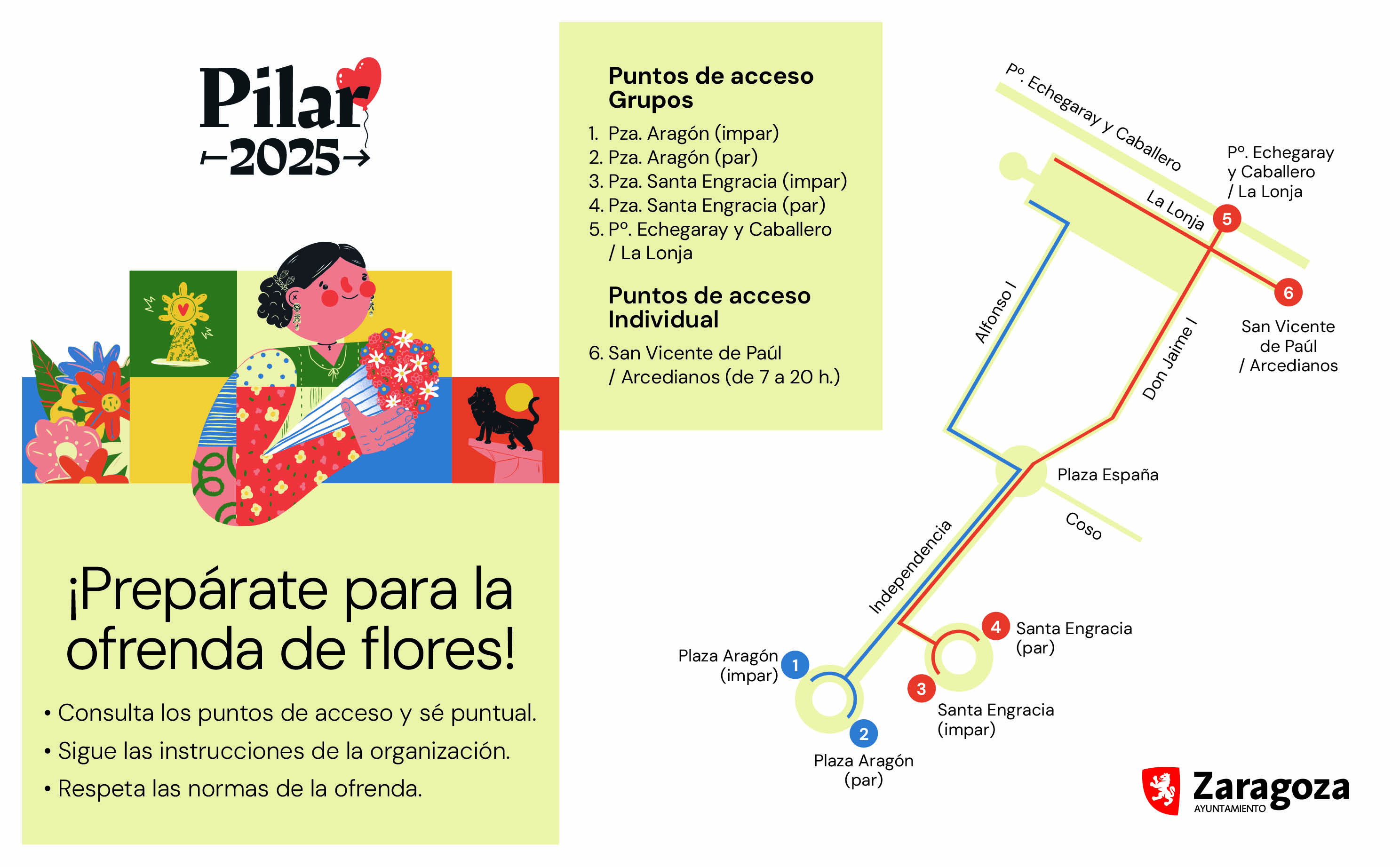 Toda la comunicación, información y consulta sobre la Ofrenda de Flores se realizará a través de la web municipal. El correo electrónico indicado a continuación será la única vía de atención al público: ofrendadeflores@zaragozacultural.com.