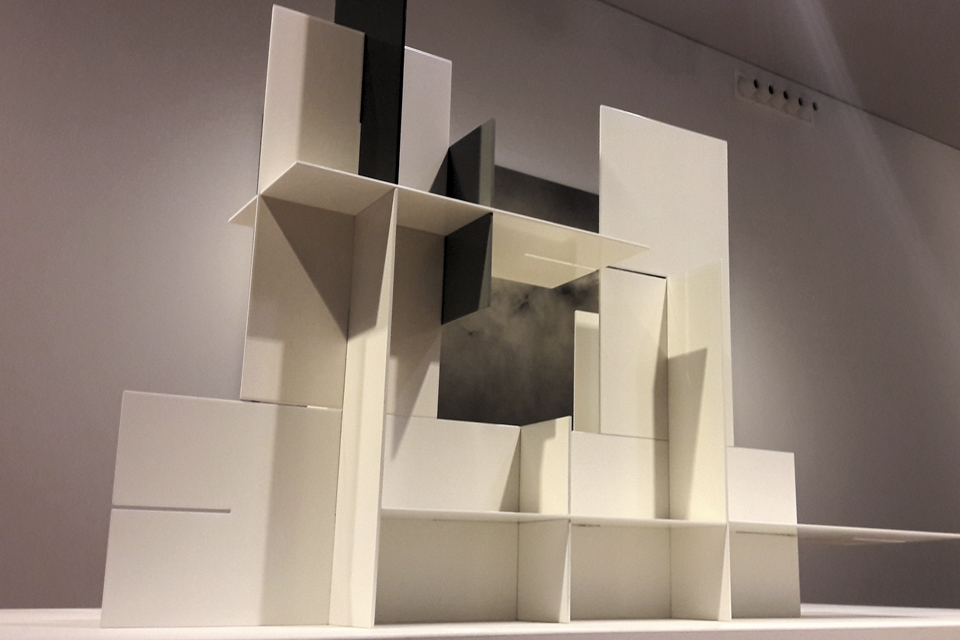 El artista reflexiona sobre la tensión del equilibrio, teniendo en cuenta dos factores. Por una parte una tricromía compuesta por tres tonalidades (gris pizarro, blanco zinc y sombra natural) y, por otra, la que constituyen tres dimensiones geométricas (el área de un plano, su mitad y la cuarta parte).