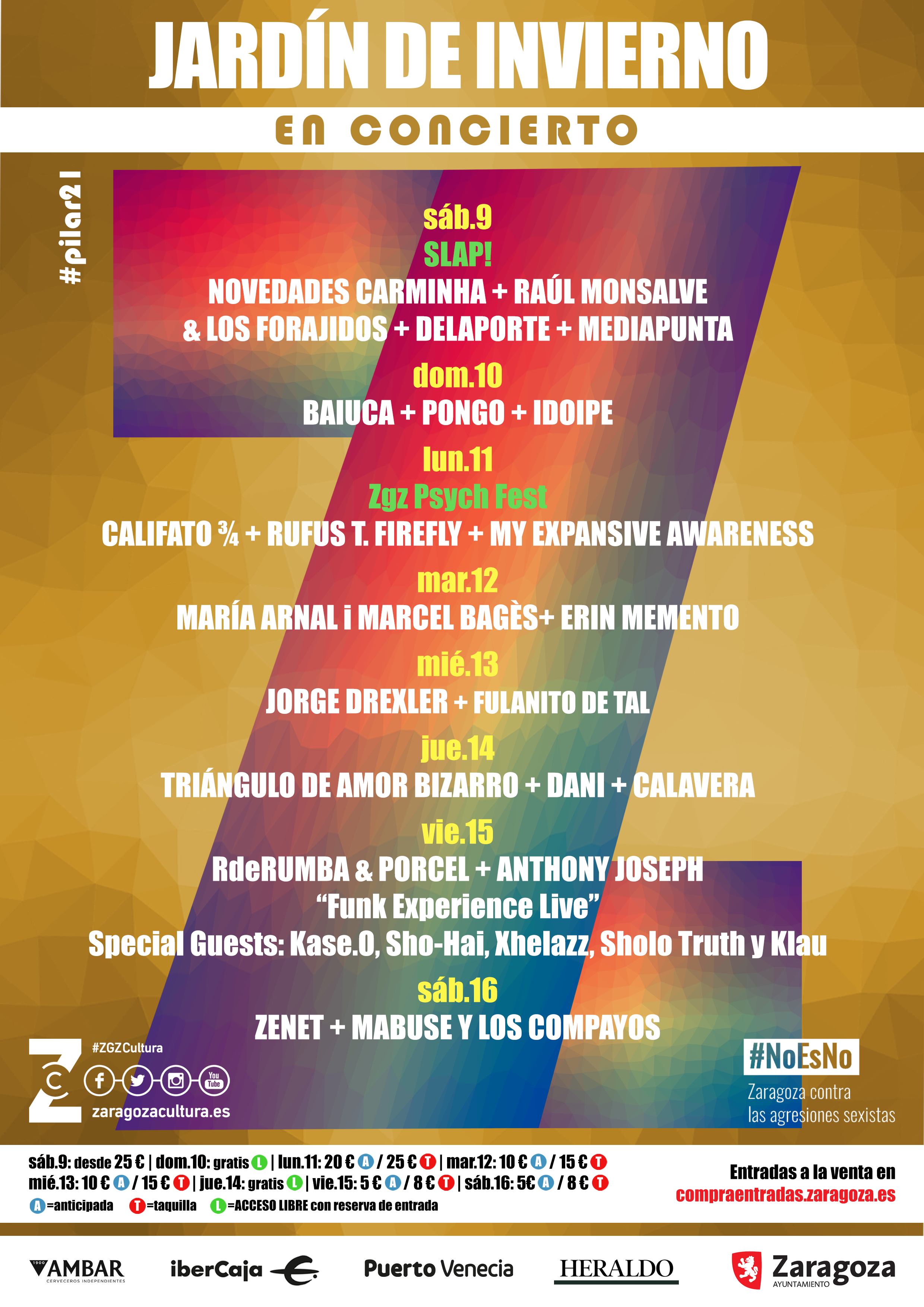 El Jardín de Invierno se convierte de nuevo en protagonista musical de la programación cultural de la ciudad de Zaragoza. Con motivo de los actos culturales previstos para el #Pilar21, y tras el éxito cosechado por el festival municipal Música al Raso, este espacio del Parque José Antonio Labordeta vuelve a acoger 21 grupos y dos festivales del 9 al 16 de octubre.