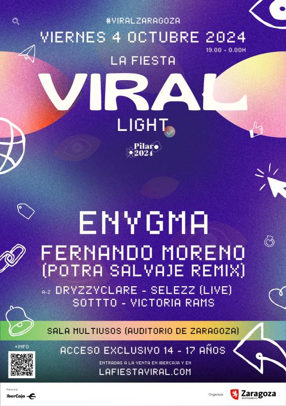 Como novedad, se ha programado la Fiesta sin alcohol Viral Light, que se celebrará entre las 19.00 y las 00.00 horas en la Multiusos. Los chicos y chicas de entre 14 y 17 años podrán disfrutar de una programación musical de calidad, con destacados dj locales y nacionales como Enygma (joven dj y productor internacional, con más de 250K seguidores en redes sociales, reconocido por ser el creador de La Previa), el dj turolense Fernando Moreno (remixer de 'Potra Salvaje'), la zaragozana DrizziClare o Victoria Rams que cerrará la noche junto a Sottto realizando un cara a cara entre estos djs locales. La tarde empezará con la actuación de Selezz, finalista del PopyRock 2023, un joven artista emergente en la escena musical, conocido por su trabajo en géneros como el reguetón y el pop urbano.