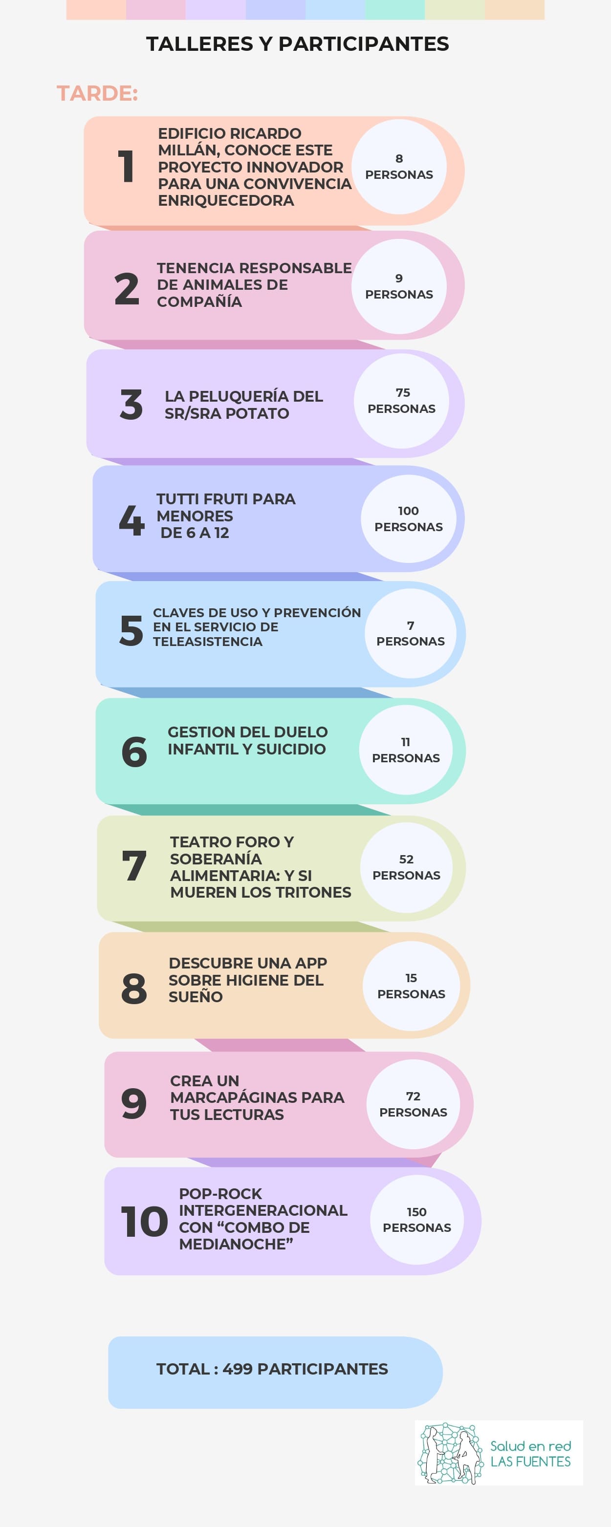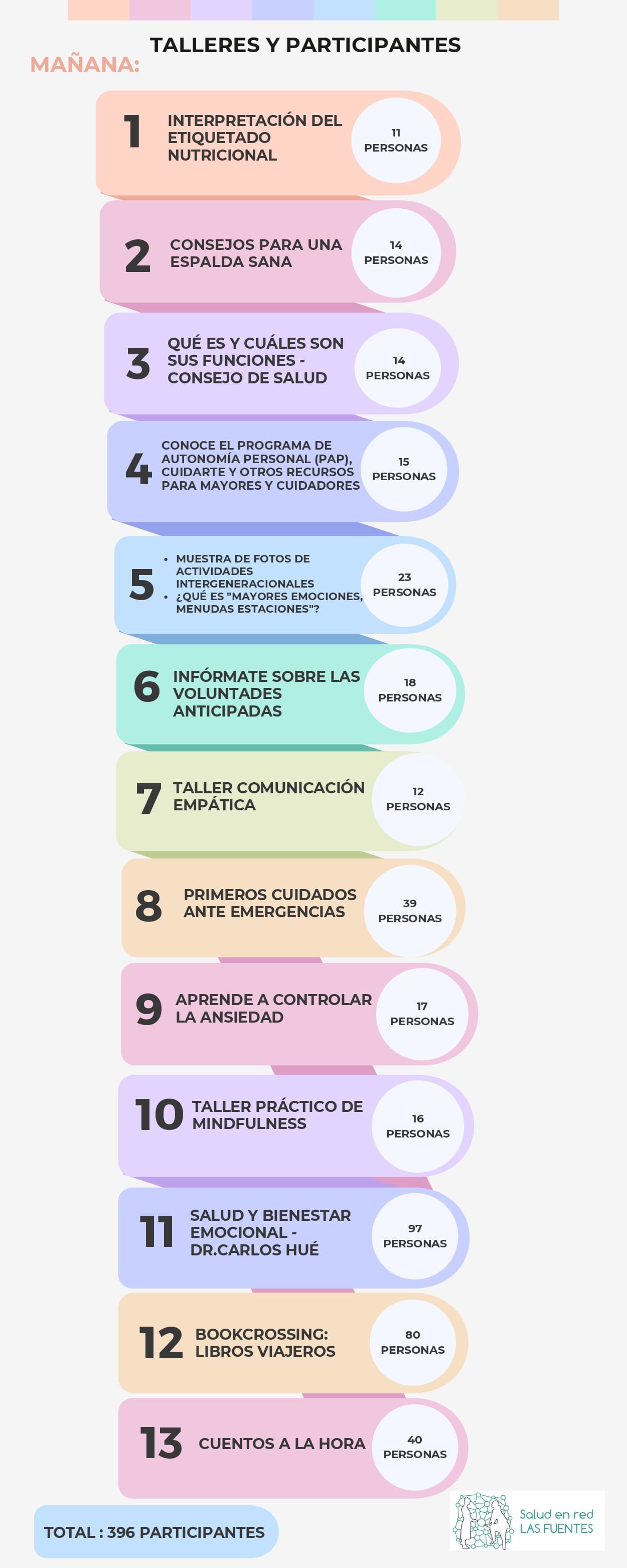 El grupo al que se impartió fue muy heterogéneo en perfiles habiendo personas jóvenes y mayores, cuidadoras, mujeres de mediana edad, niño/as, personal de enfermería...Por tanto fue muy enriquecedor para todos los participantes debido al conocimiento de las diferentes circunstancias que nos afectan a las necesidades del sueño según ciclos vitales.