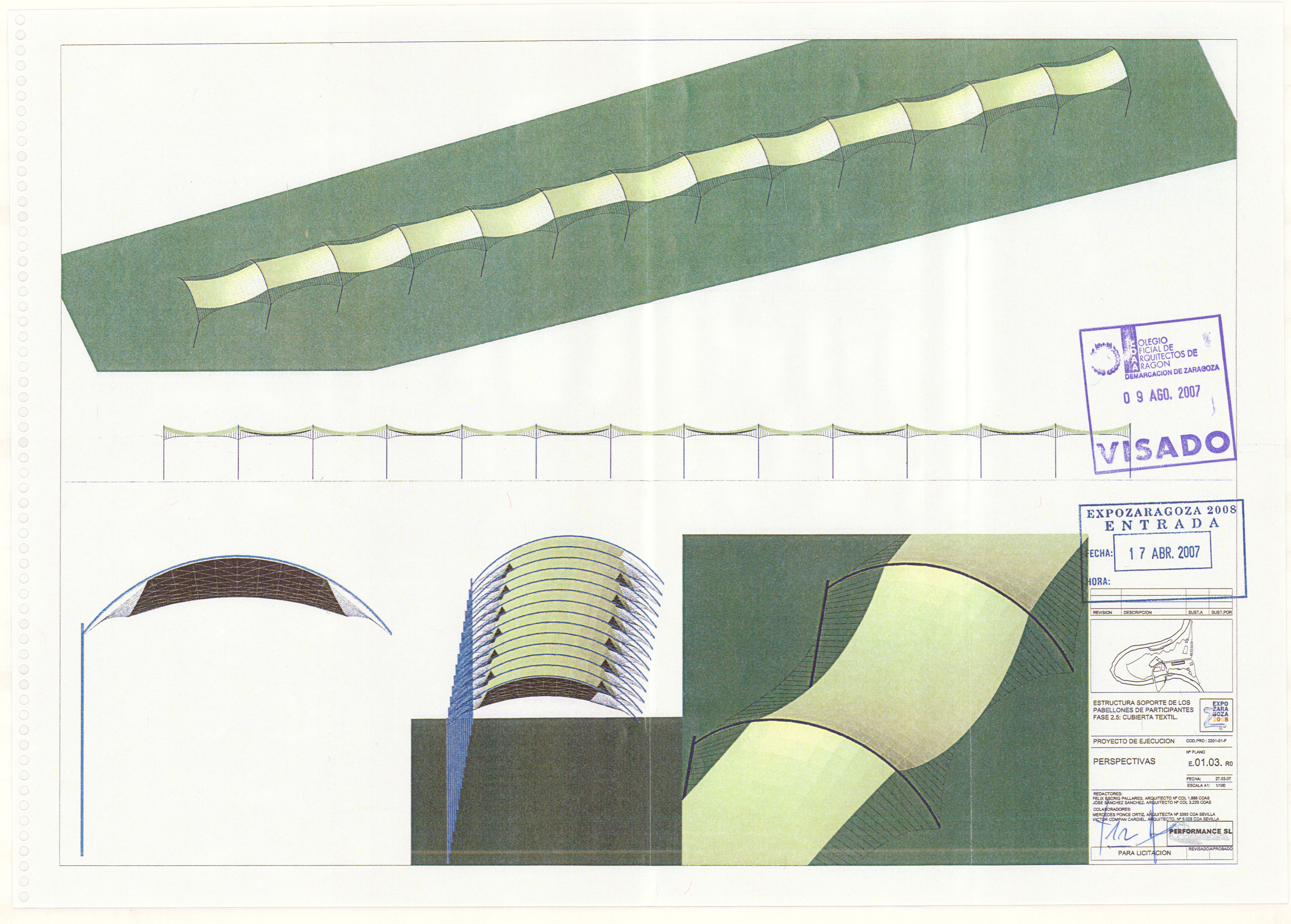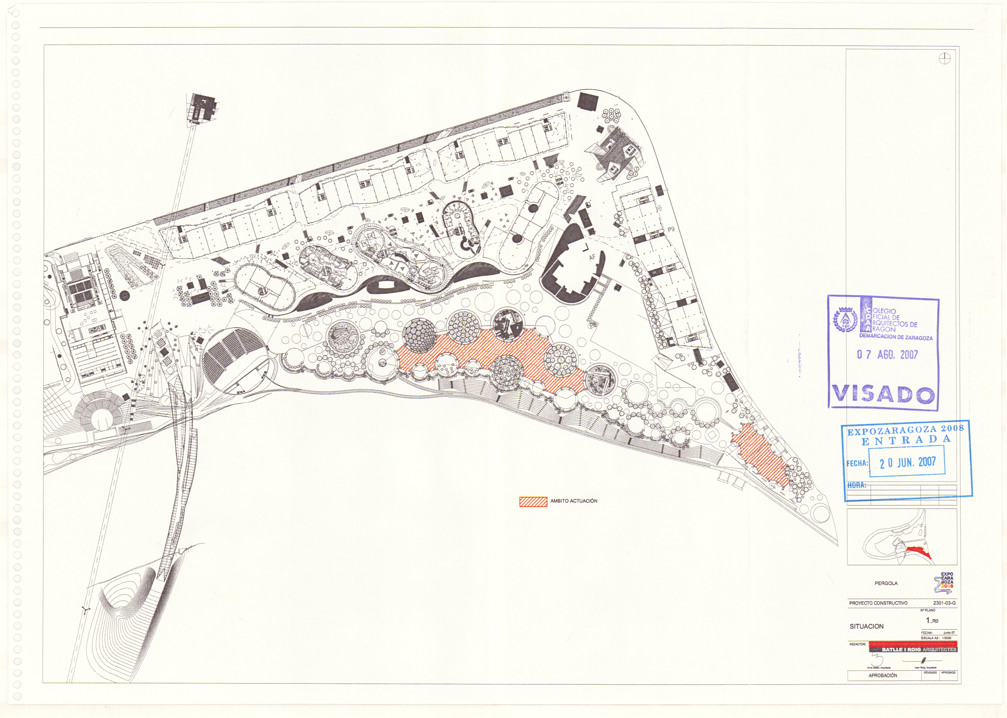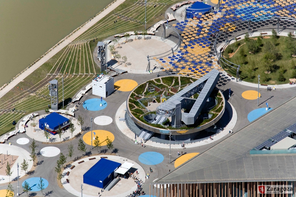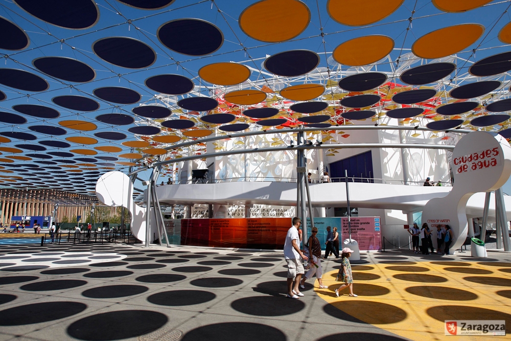Las pérgolas se situaban en dos zonas: cerca del acceso por la Puerta del Ebro (más de 2300 m2) y como elemento de unión entre varias plazas temáticas del frente fluvial (otros 7500 m2). Se configuraron como una retícula de malla de acero, en cada cuadrado de 2 x 2 metros se colocaba un círculo textil de 1,6 metros de diámetro de color azul o amarillo. Además estas estructuras soportaban una red de nebulizadores de agua. El diseño correspondió a Batlle y Roig y la ejecución, a Arenas & Asociados.