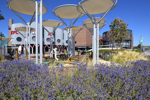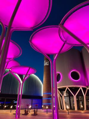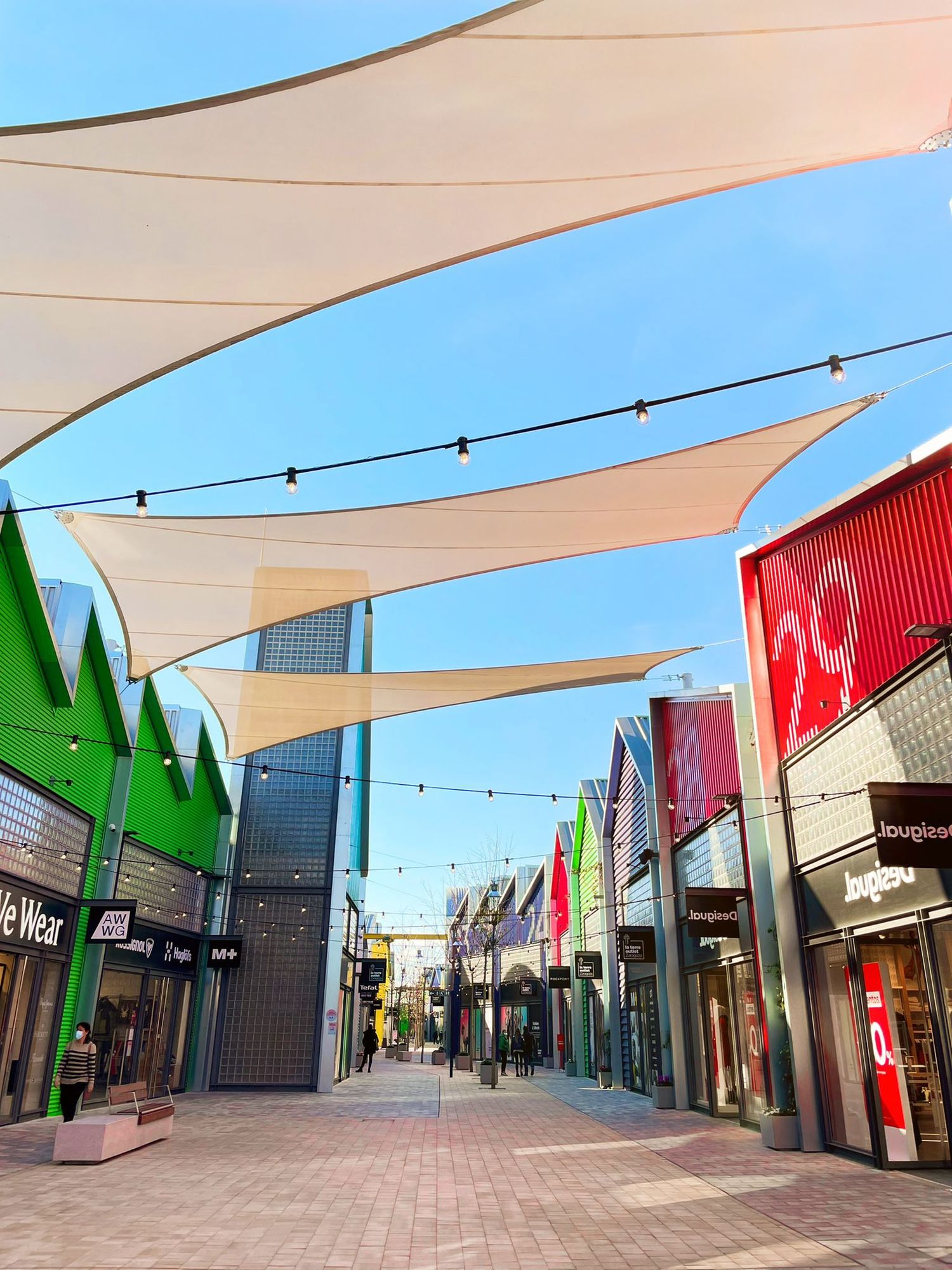 Centro comercial de estilo industrial, moderno y colorido con un estilo futurista. Los edificios son de metal y colores. Espacio al aire libre.