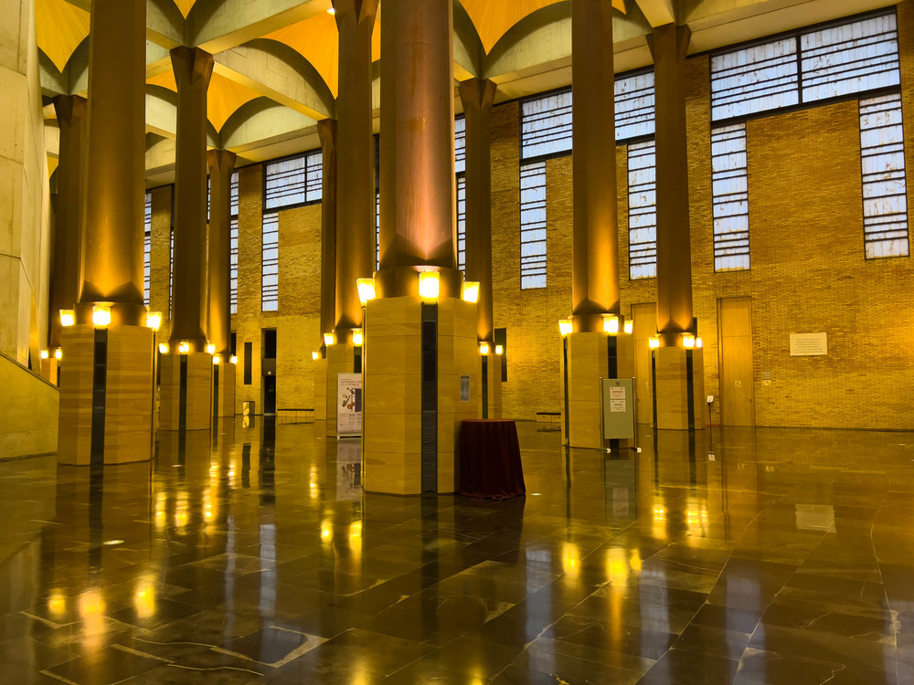 El Auditorio o Palacio de Congresos de Zaragoza es un complejo inaugurado en 1994 para la celebración de los más grandes eventos como congresos, convenciones, ferias, musicales, reuniones de empresa, actos políticos y sociales. El edificio recuerda a la arquitectura local del renacimiento, es como uno de los palacios renacentistas de la Zaragoza del siglo XVI con aires de grandeza. Destaca el gran alerón que recuerda a los de madera que tenían las antiguas casas nobles de la ciudad. Dispone de un total de 25.500m2 destacan las salas: Sala Mozart: dependencia principal del complejo con capacidad para 1992 personas, tiene un escenario de 340 m2. Esta sala goza de una de las mejores acústicas de todo el mundo y es de gran belleza. Sala Luis Galve: con capacidad para 429 personas y un escenario de 120 m2, este espacio es normalmente empleado para conciertos de cámara. Sala Mariano Gracia: sala utilizada para conferencias y congresos que cuenta con una capacidad para 200 personas. Sala Multiusos: espacio diáfano de 2.215 m2 y un escenario de 425 m2. Estas instalaciones se emplean para todo tipo de eventos, desde conciertos a mercadillos y exhibiciones. Tiene una capacidad para 6.500 personas de pie o 2.500 sentadas. Sala hipóstila (gran hall) y sala de videoconferencias. Suman una capacidad de 10.000 personas. Sus instalaciones poseen una gran capacidad de adaptación a las necesidades del organizador. Las salas principales destacan por sus acabados en madera. La Sala Mozart está considerada, igualmente, como una de las que cuenta mejor acústica de los escenarios europeos. El Auditorio - Palacio de Congresos de Zaragoza es un complejo inaugurado el 5 de octubre de 1994 para la celebración de los más grandes acontecimientos musicales; y también para la organización de eventos como congresos, convenciones, ferias, reuniones de empresa, actos políticos y sociales. El Auditorio dispone de un total de 25.500m2 y varias salas (Sala Mozart, Sala Luis Galve, Sala Mariano Gracia, Sala de Videoconferencia, 11 Salas de reuniones, Sala Multiusos y Sala Hipóstila), que en total suman una capacidad de 10.000 personas. Sus instalaciones poseen una gran capacidad de adaptación a las necesidades del organizador. En concreto, el interior del edificio destaca por sus pilares de gran altura.
