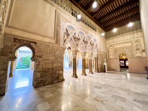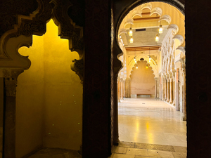 La Aljafería está considerada como una de las cimas del arte hispano-musulmán, junto con la Alhambra de Granada y la Mezquita de Córdoba, siendo el palacio islámico situado más al norte de Europa, además de ser el más lujoso y mejor conservado de la época de Taifas. Fue residencia de recreo de los reyes musulmanes y refleja el esplendor alcanzado por el reino taifa en su máximo apogeo político y cultural. Ha sido recinto fortificado, residencia real aragonesa, sede y cárcel de la Inquisición, palacio de los Reyes Católicos, cuartel y, desde 1987, flamante sede de las Cortes de Aragón. En la actualidad, es sede de las Cortes de Aragón. Sus estancias guardan secretos como el `Mirhab¿, que servía de mezquita u oratorio privado del rey musulmán y su corte, construido en el siglo XI y orientado hacia La Meca. A él se accede a través de una puerta con arco de herradura, inspirado en la Mezquita de Córdoba. Destacan los espacios Torre del Trovador, Palacio Taifa, Patio Santa Isabel, Salón Dorado, Palacio Mudéjar, Palacio Reyes Católicos, Salón del Trono. También con impresionantes exteriores con un foso de grandes dimensiones, rodeado de zona ajardinada.