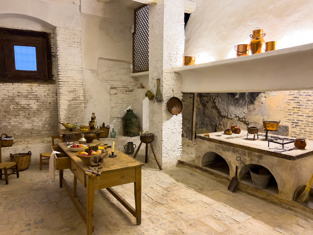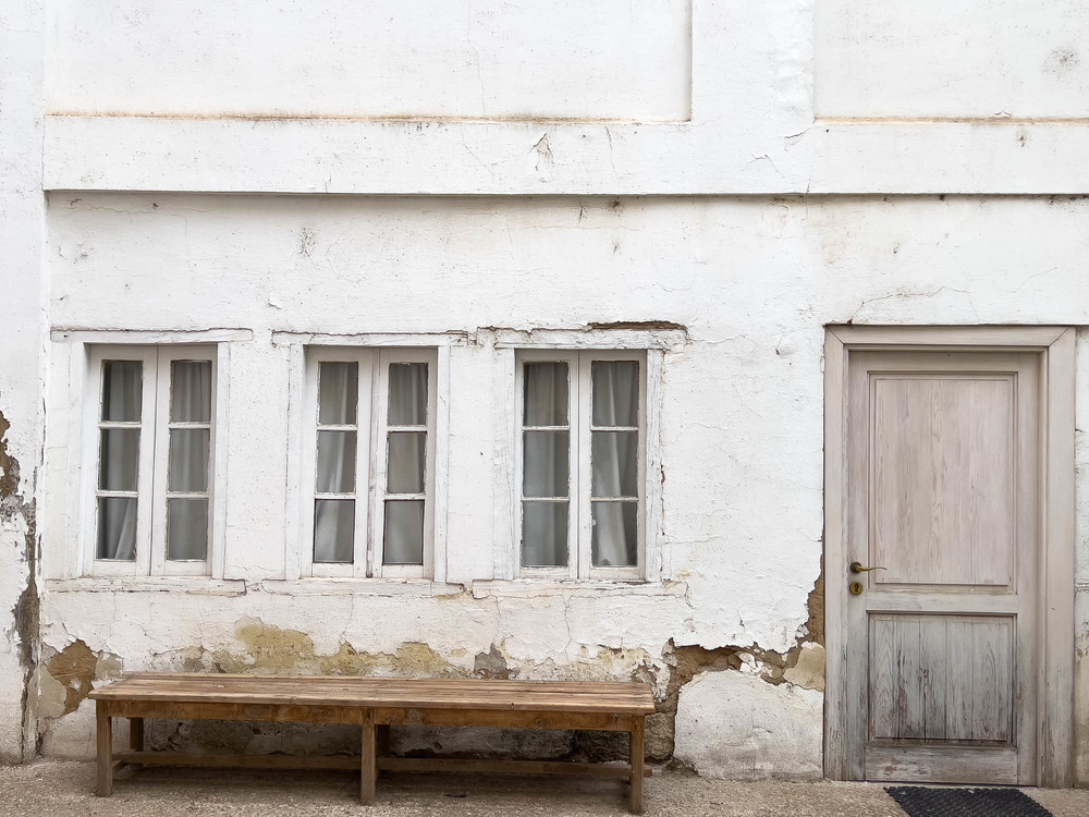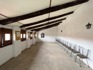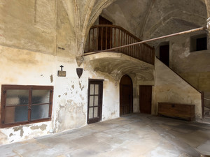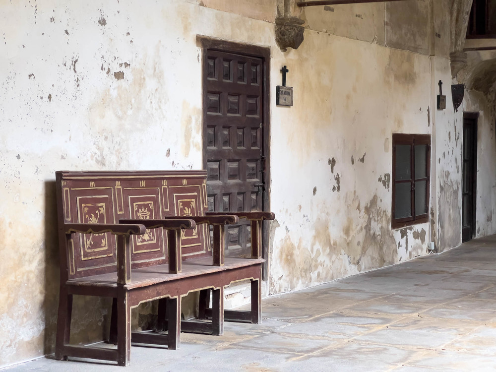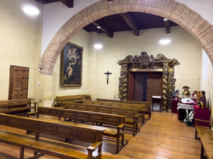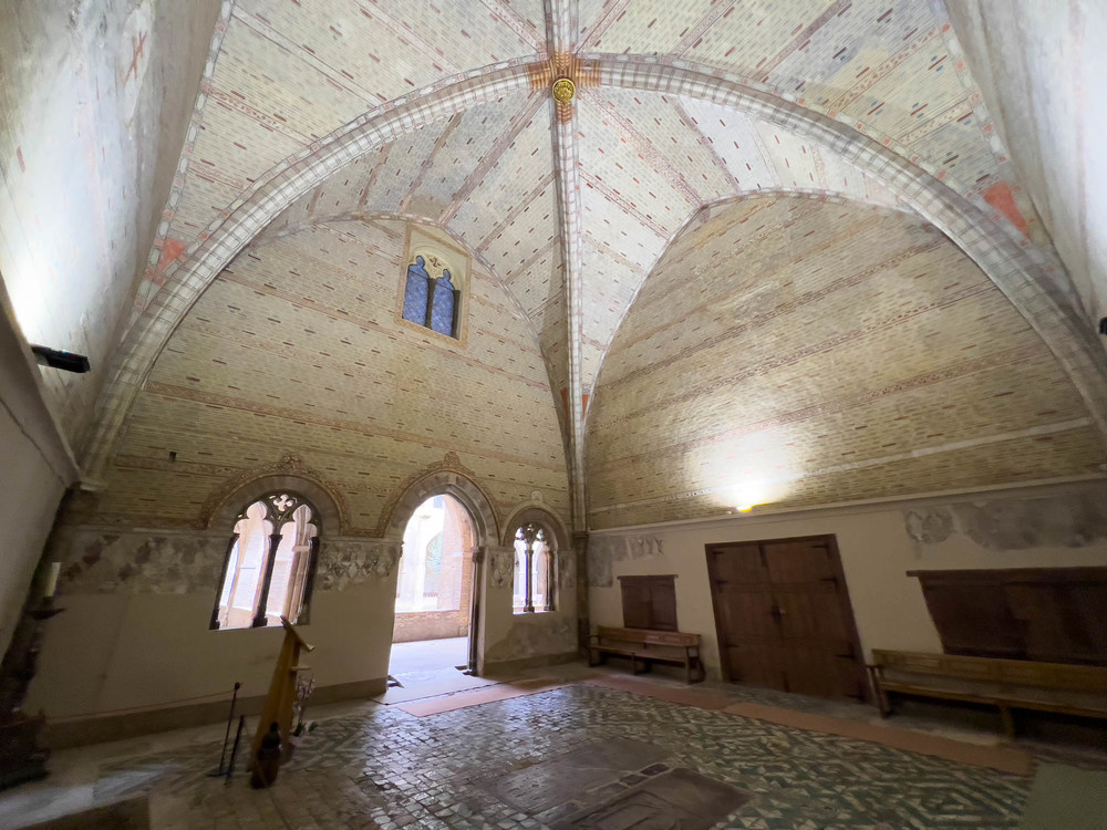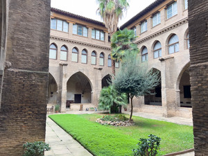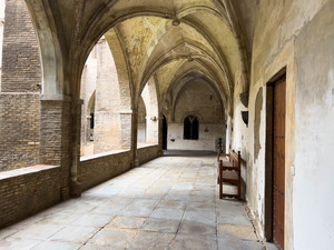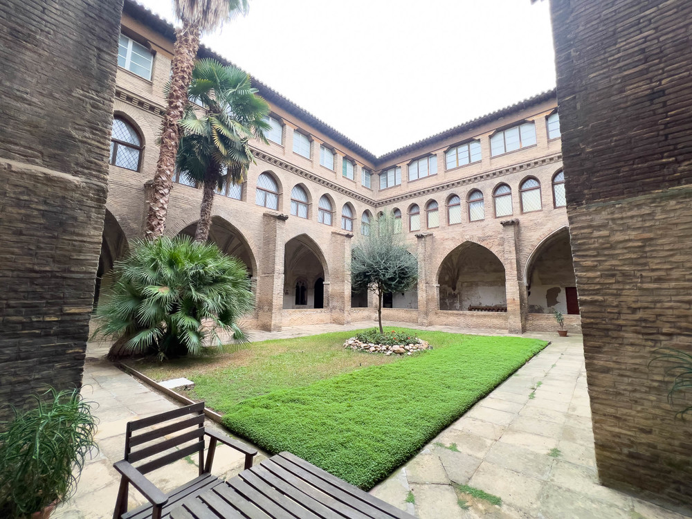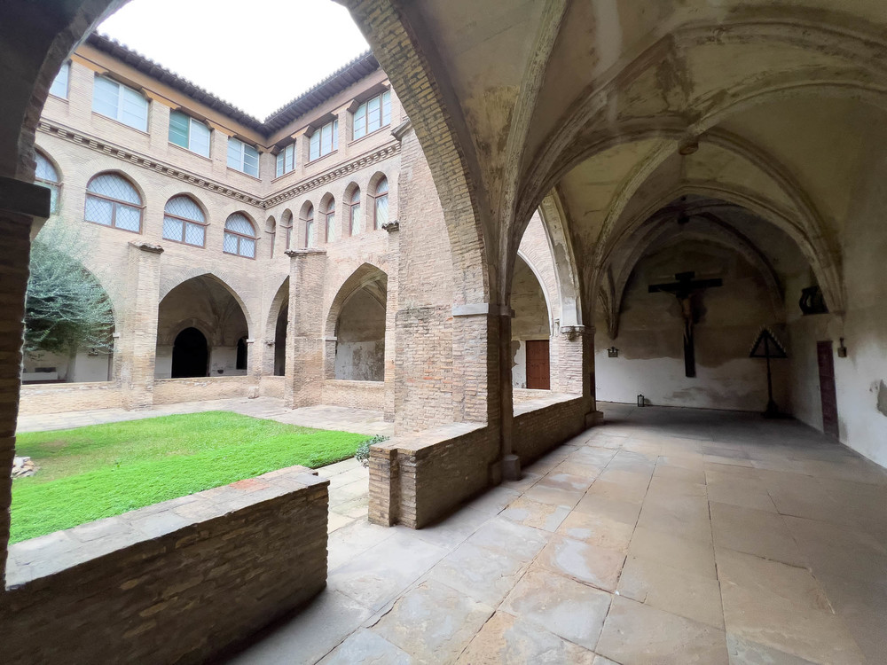 monasterio, atrio, patio interior, rezo, culto, rezar, paredes blancas, ladrillo visto,