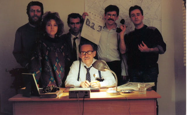 El asunto Taylor (Chirivbito Films, 1987). De pie y de izda. a dcha. Jesús Ferrer, Cristina Yáñez, Rafael Campos, Carlos Pomarón y Juan José Lombarte, abajo sentado José Luis Pomarón.