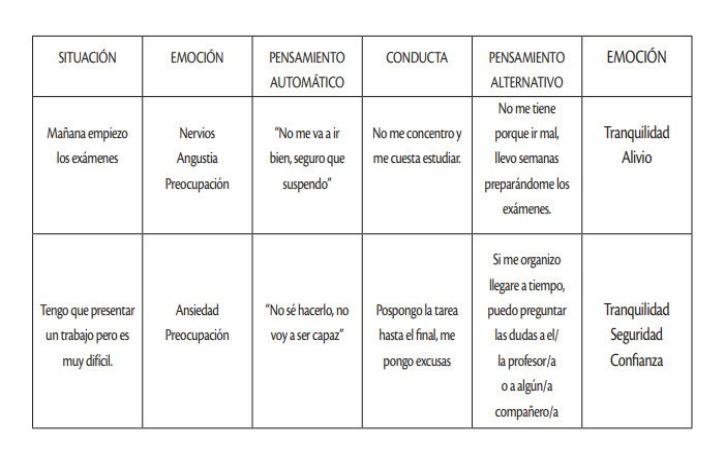 - Los pensamientos negativos que he tenido ¿han sido beneficiosos para mí? Y busca pensamientos alternativos que te hagan sentir mejor. El objetivo es que más adelante seas capaz de hacer este ejercicio de manera automática y poder gestionar mejor estos pensamientos.