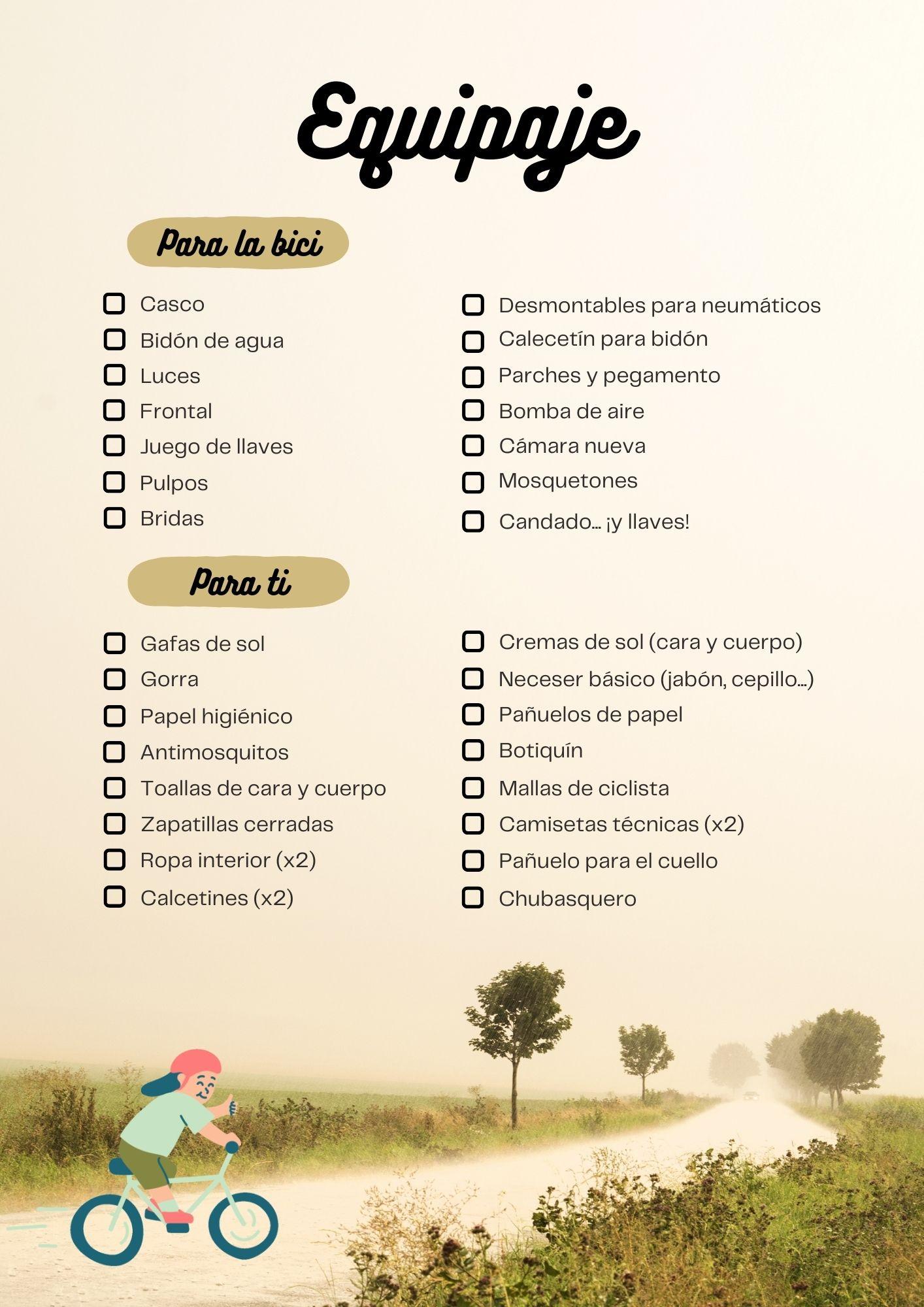 ¡Ya solo queda hacer el equipaje! Aquí, claro, nada de maletas, sino un buen par de alforjas. Piensa que cuanto más te cargues, más esfuerzo vas a tener que hacer, así que intenta ir ligero/a. Como aquí nos vamos quedando ya sin espacio, te hemos preparado un listado de las cosas que tienes que llevar sí o sí, que te puedes descargar. ¡Que vaya bien!