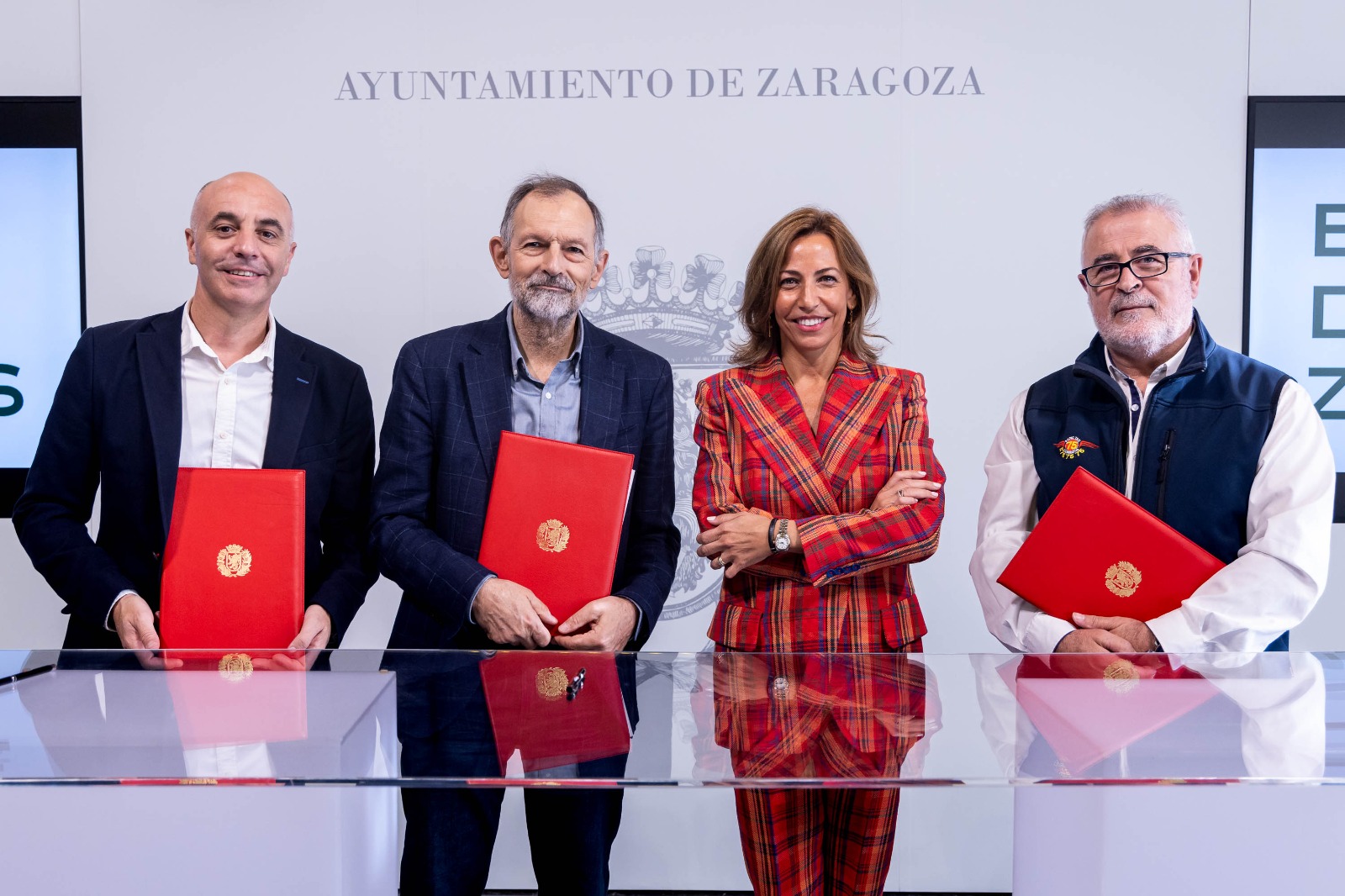 Al acuerdo de colaboración han asistido Natalia Chueca, consejera de Servicios Públicos y Movilidad del Ayuntamiento de Zaragoza; Victor Viñuales, director ejecutivo de Ecodes y Sergio Artal, presidente de la cooperativa auto-taxi zaragoza.