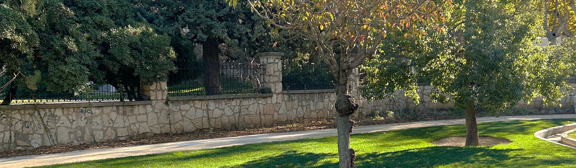 Dispuestas frente al muro perimetral, aportan estructura vertical, persistencia y contraste. Incluyen especies mediterráneas de floración destacada (Phlomis, Coronilla, Pistacia, Vitex) y generan un fondo vegetal que enmarca el resto de las plantaciones. A sus pies se sitúan gramíneas ornamentales que añaden movimiento y estacionalidad.