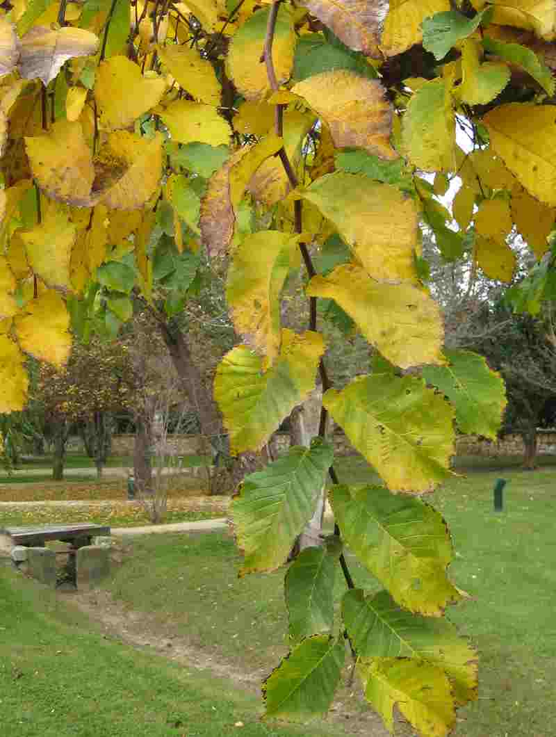 Las hojas son de tacto áspero y como la mayoría de los olmos asimétricas en su base.