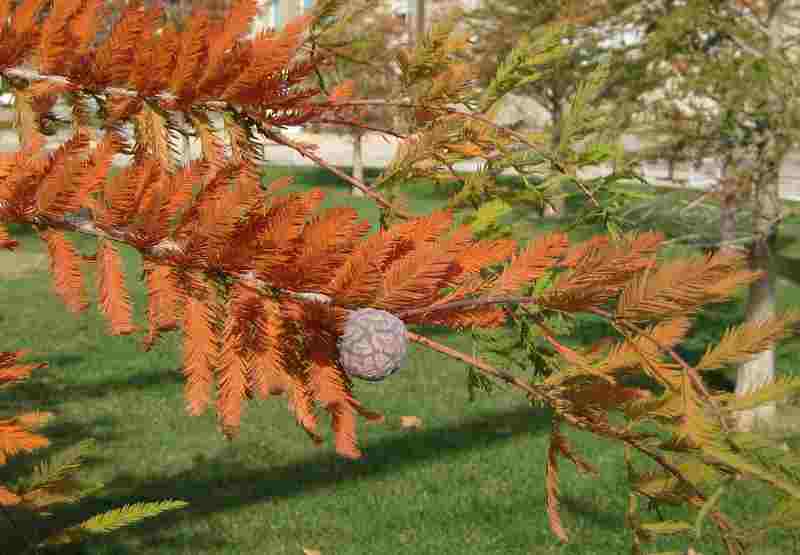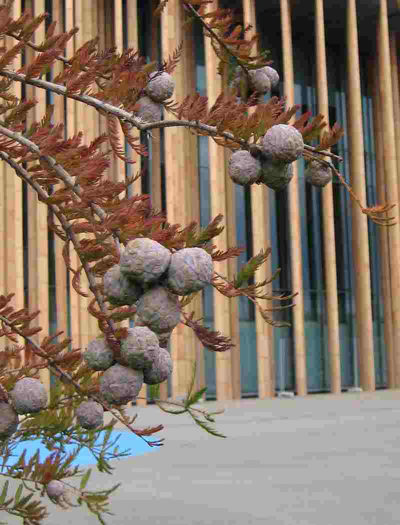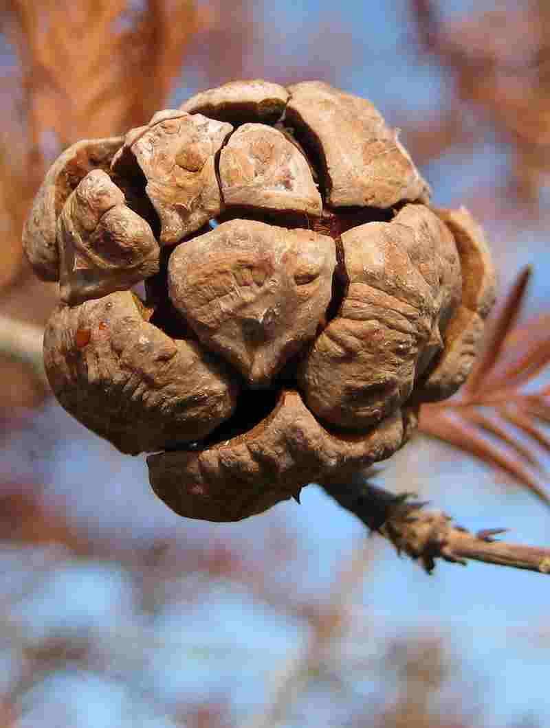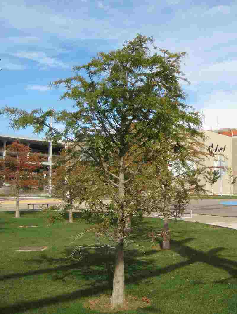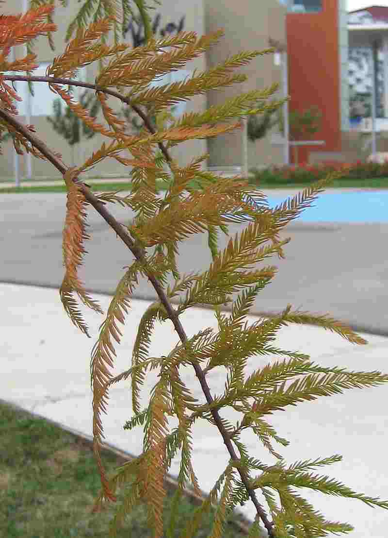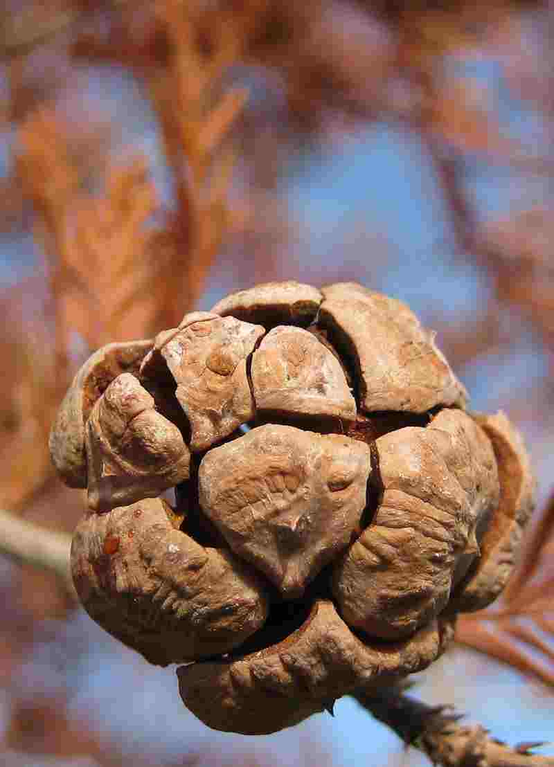 En su hábitat natural, la base del tronco está ensanchada, apareciendo unas protuberancias leñosas huecas llamadas neumatóforos, que sirven para que las raíces puedan respirar en las zonas pantanosas. Es una de las pocas coníferas que pierden la hoja. - Tipo