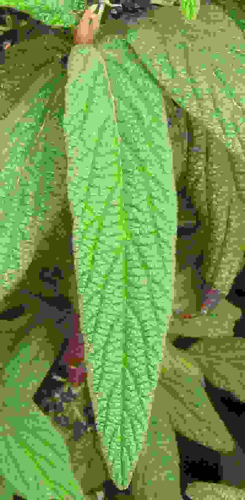 Hojas largas y estrechas con nervaduras muy marcadas de color verde intenso más claras en el envés y ásperas al tacto. - Tipo