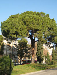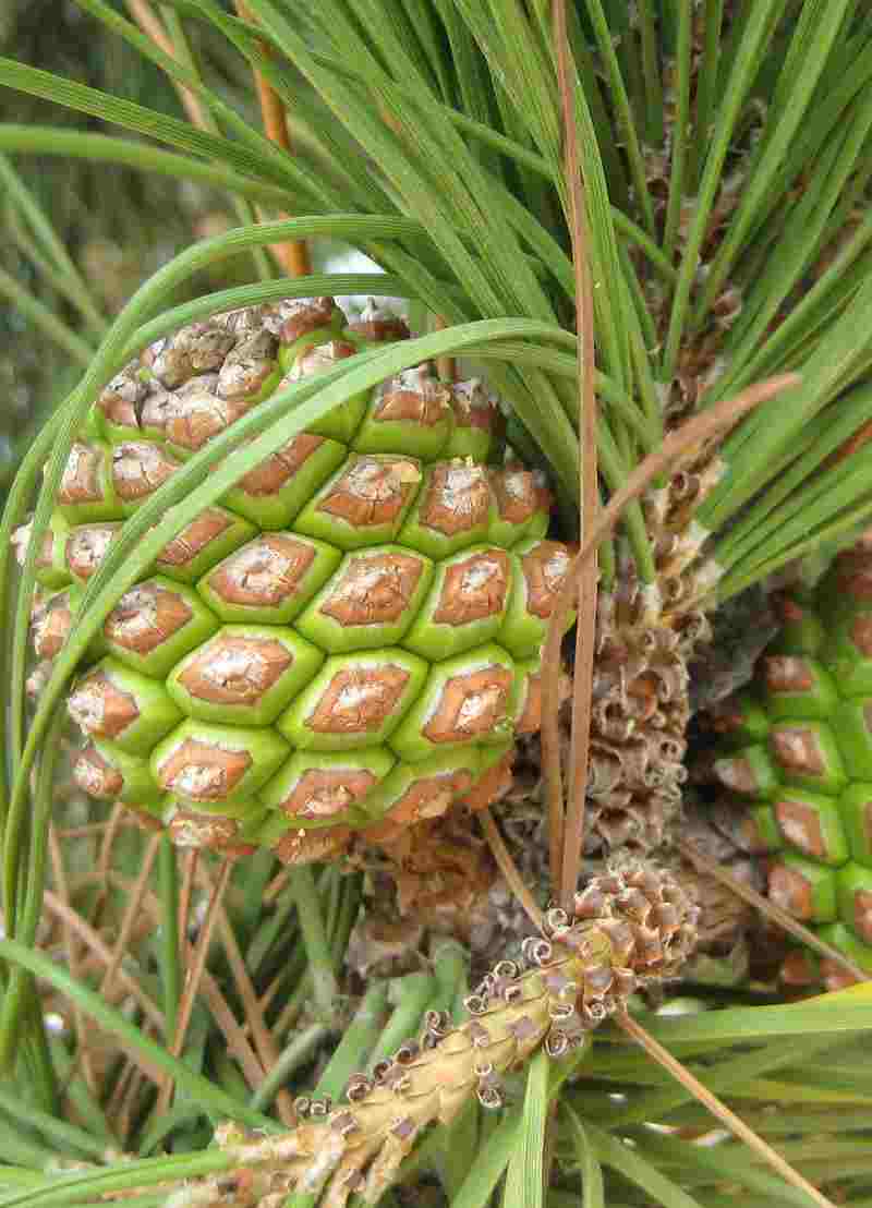 Su nombre específico pinea, nos recuerda que este pino produce piñones comestibles.