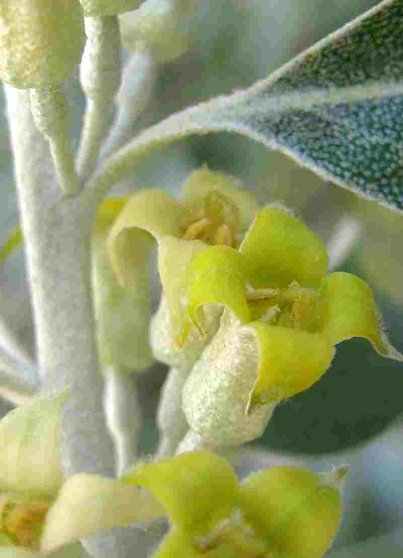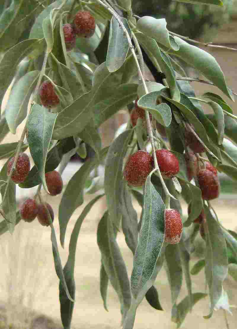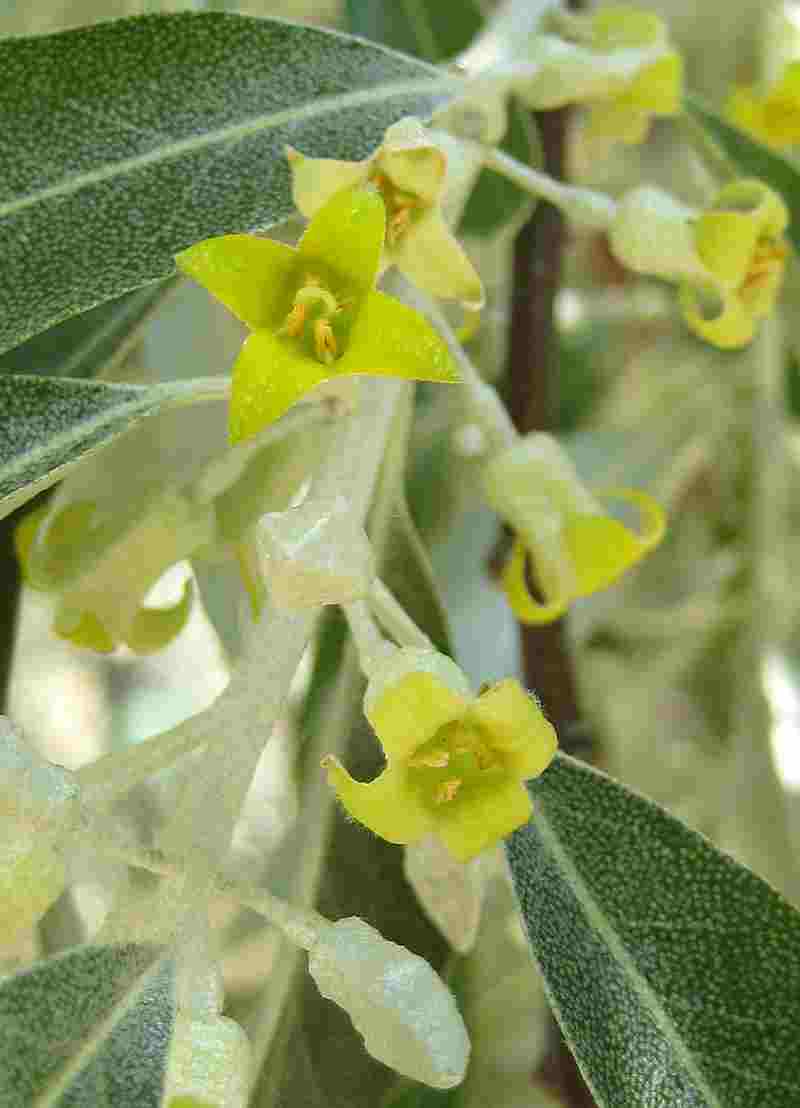 - El nombre eleagnus proviene de dos palabras griegas: eleia, (olivo) y gennao, (originar algo similar) y hace referencia a la similitud de las hojas de éste árbol con las del olivo.