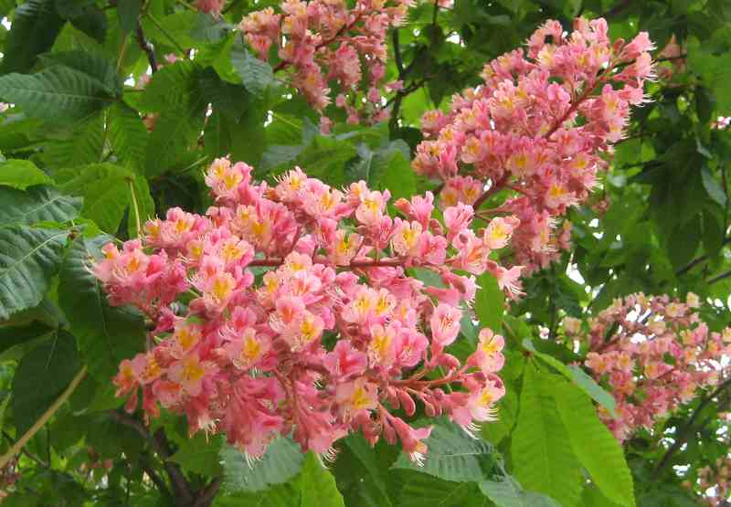 - Aesculus es el nombre latino de una encina. El específico carnea, de color carne o rosado por el color de sus flores.
