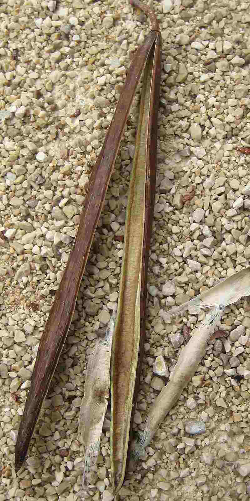 Sus frutos, que suelen permanecer durante el invierno, son unas cápsulas muy alargadas (como puros) que contiene numerosas semillas aladas con pelos blancos en los extremos. - Tipo