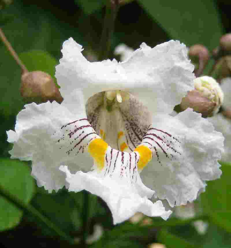 El específico bignonioides, se refiere al parecido de las flores con los de una Bignonia. Sus flores son blancas con tonos amarillos y morados.