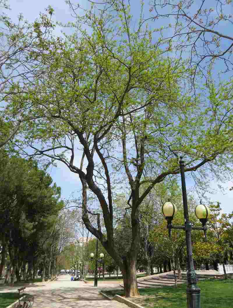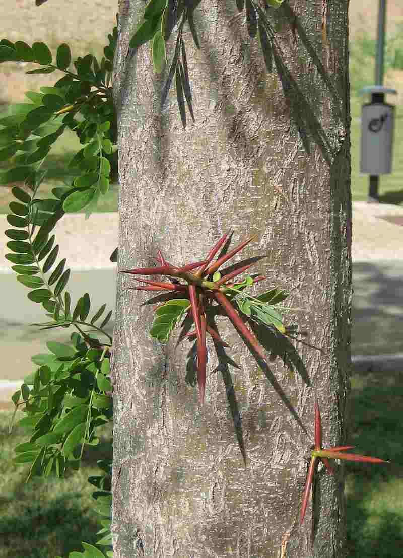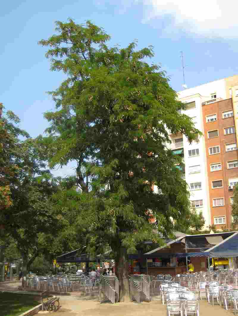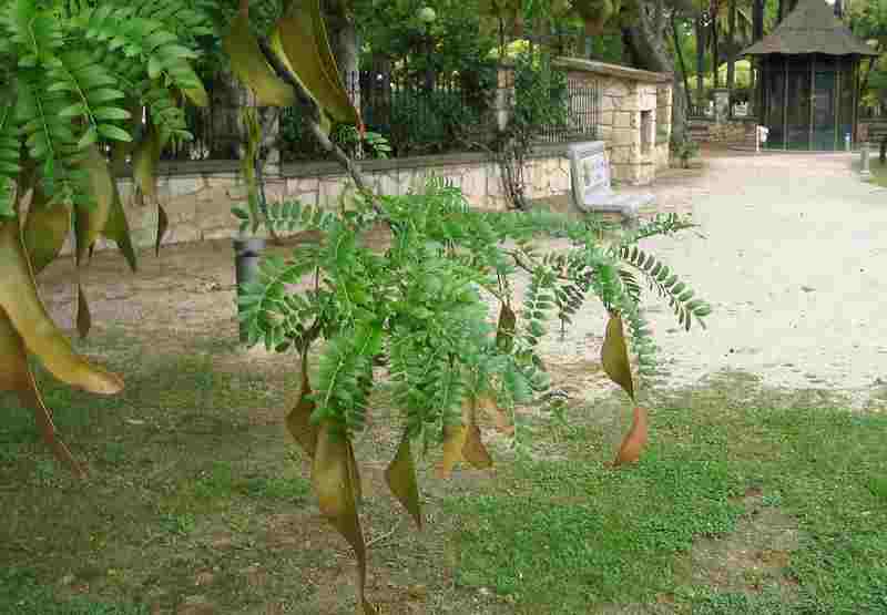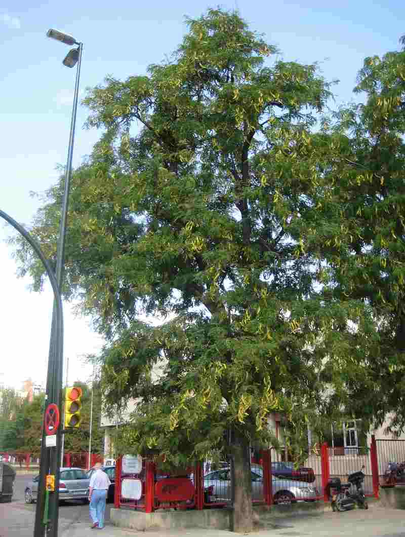 - El género Gleditsia, dedicado a J.Gottlieb Gleditsch, profesor de Botánica en Berlín (s. XVIII). Triacanthos, proviene del griego, y significa "con tres espinas", debido a las espinas que presenta el tronco y las ramas. Procede del este de Norteamérica y norte de Méjico.