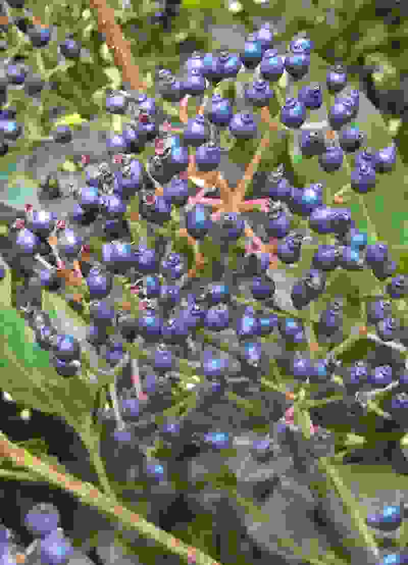 Las flores se agrupan en corimbos, es decir, nacen en distintos puntos pero llegan a la misma altura. El fruto de color azul metálico o casi negruzco tiene un solo hueso. - Tipo