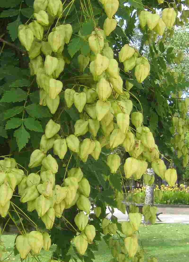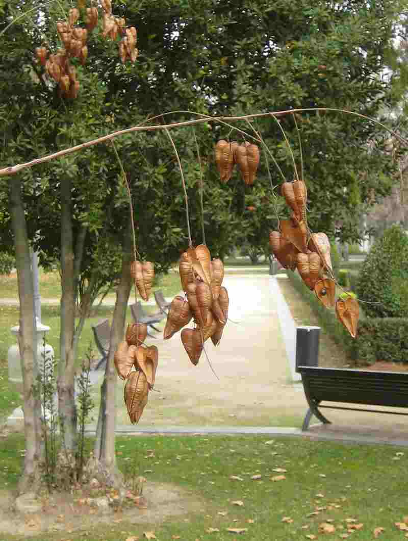 También se le denomina comúnmente el árbol de los farolillos, debido a la multitud de frutos que cuelgan (cápsulas ovoides infladas) de sus ramas a modo de pequeños farolillos, como de papel, que al moverse con el viento producen un sonido peculiar. - Tipo
