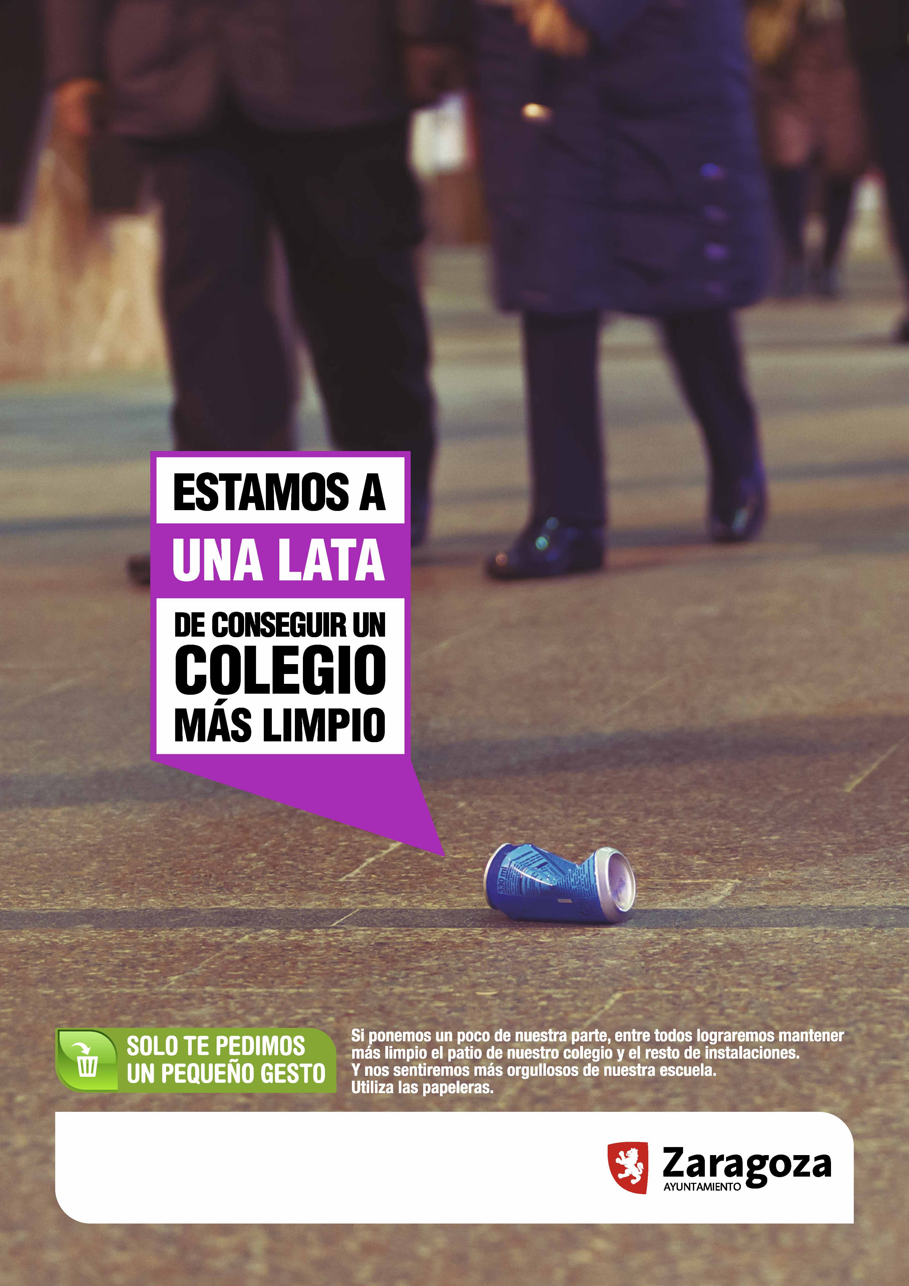 La campaña de sensibilización sobre limpieza pública que, hasta ahora, se ha llevado a cabo en Zaragoza - a través de mensajes en prensa, radio y TV, así como en mupis en la vía pública -, llega también a los colegios. El Ayuntamiento de Zaragoza, a través del Área de Servicios Públicos y Movilidad, ha elaborado una adaptación de los mensajes emitidos en dicha campaña, enfocándolos al cuidado y respeto de los patios de recreo y las instalaciones de los centros educativos.