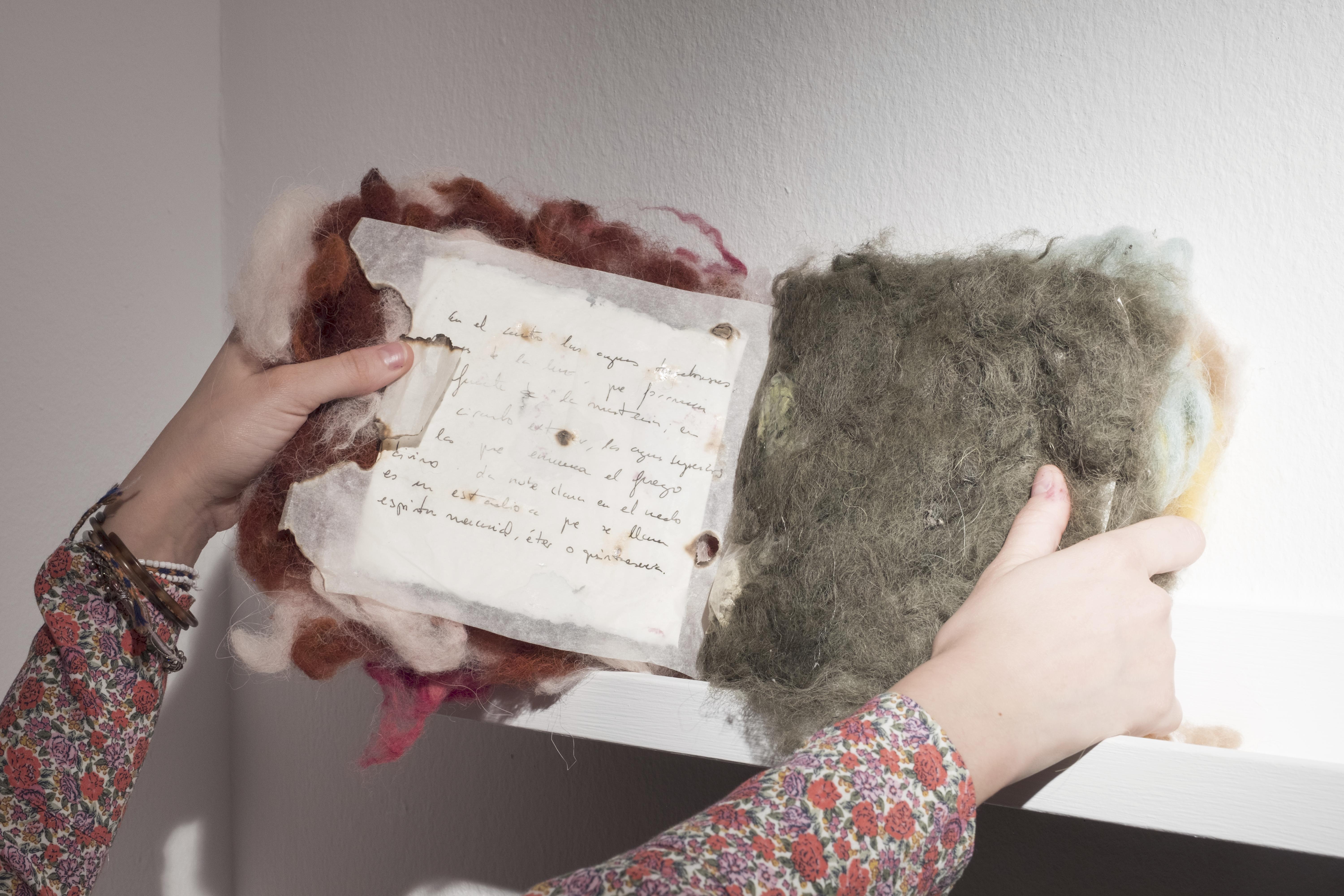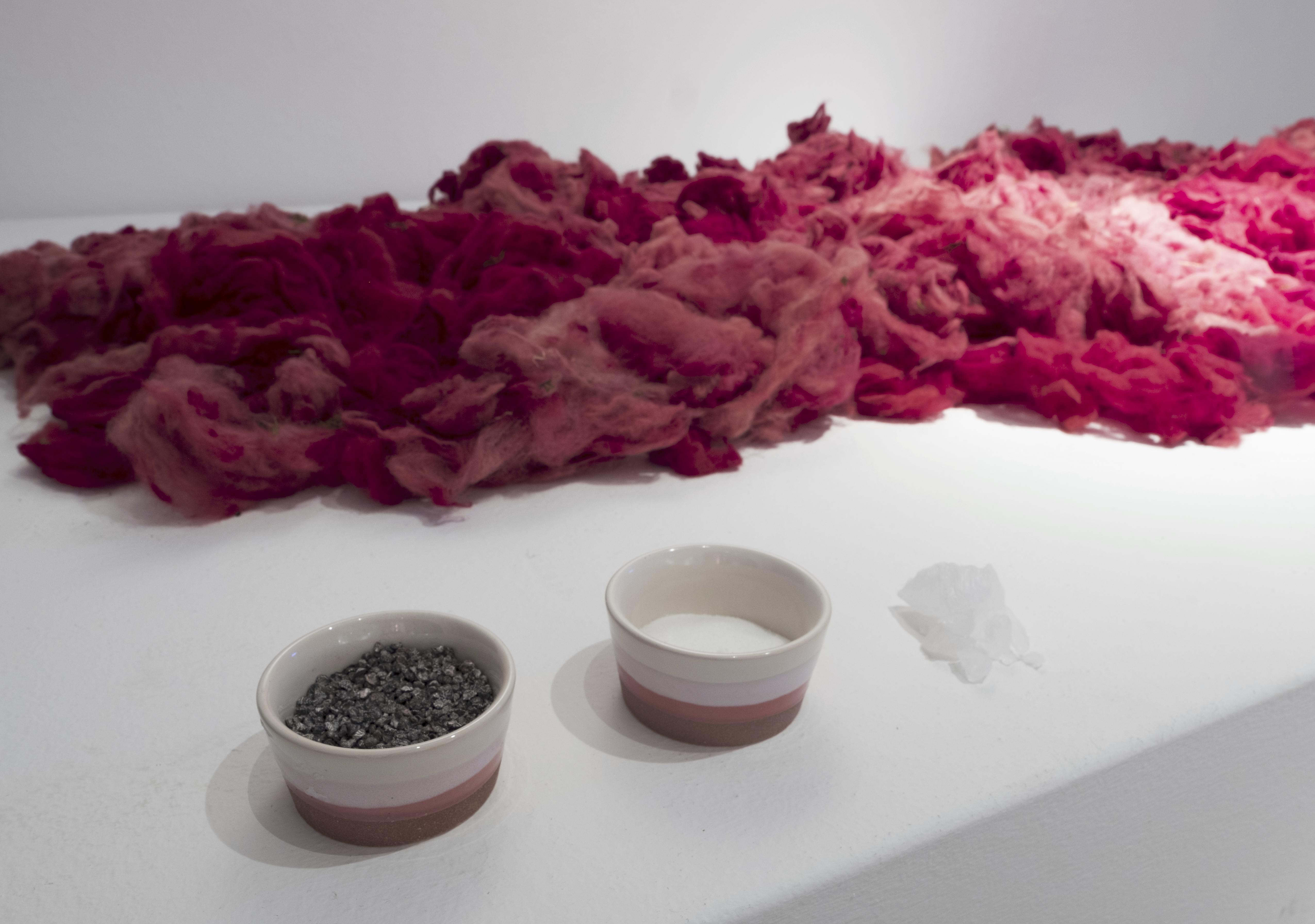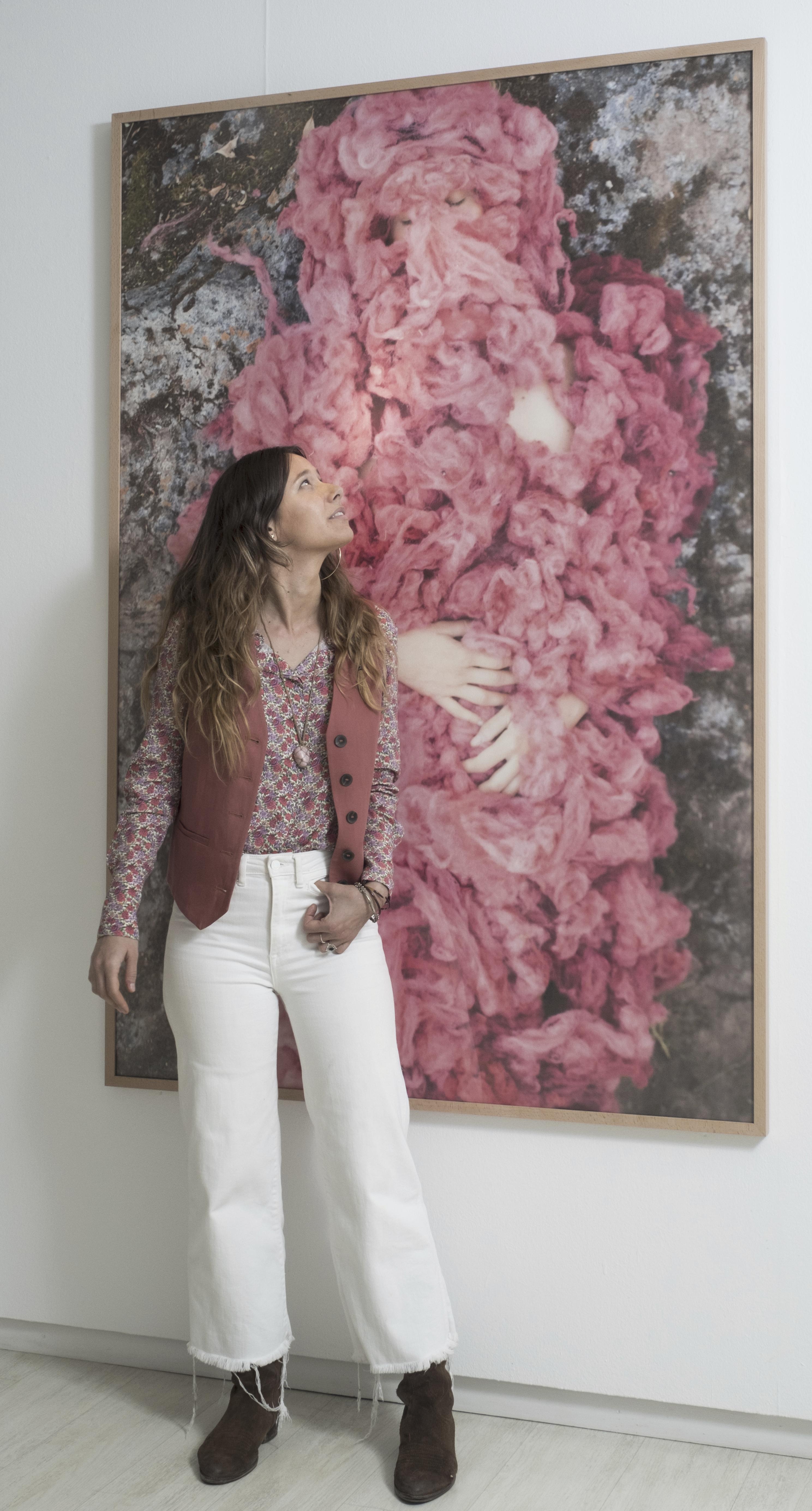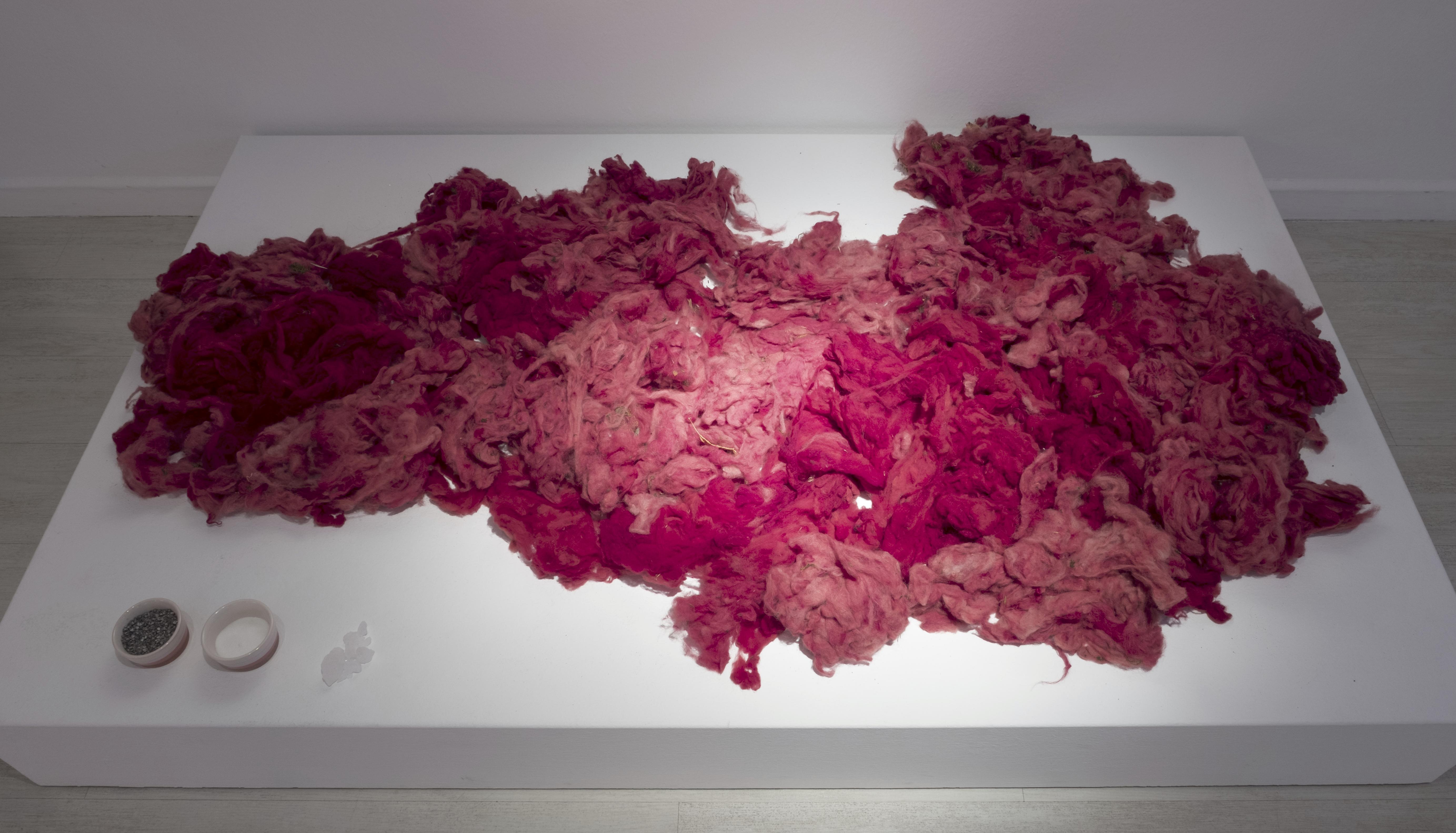 El empleo de la piel de alpaca teñida con un insecto como la cochinilla me ha servido para crear un nuevo tejido a mi cuerpo. Un florecer que produce una metamorfosis mágica de sanación, resurgiendo de los líquenes y el musgo, de las rocas agrietadas y el aire caliente que levanta remolinos de polvo y resiste a la tempestad. De este modo tematizo igualmente la preocupación por la pérdida de nuestros instintos y los ciclos vitales naturales, subsumidos por la cultura o por el ego y que llevan a un estado próximo a la destrucción.