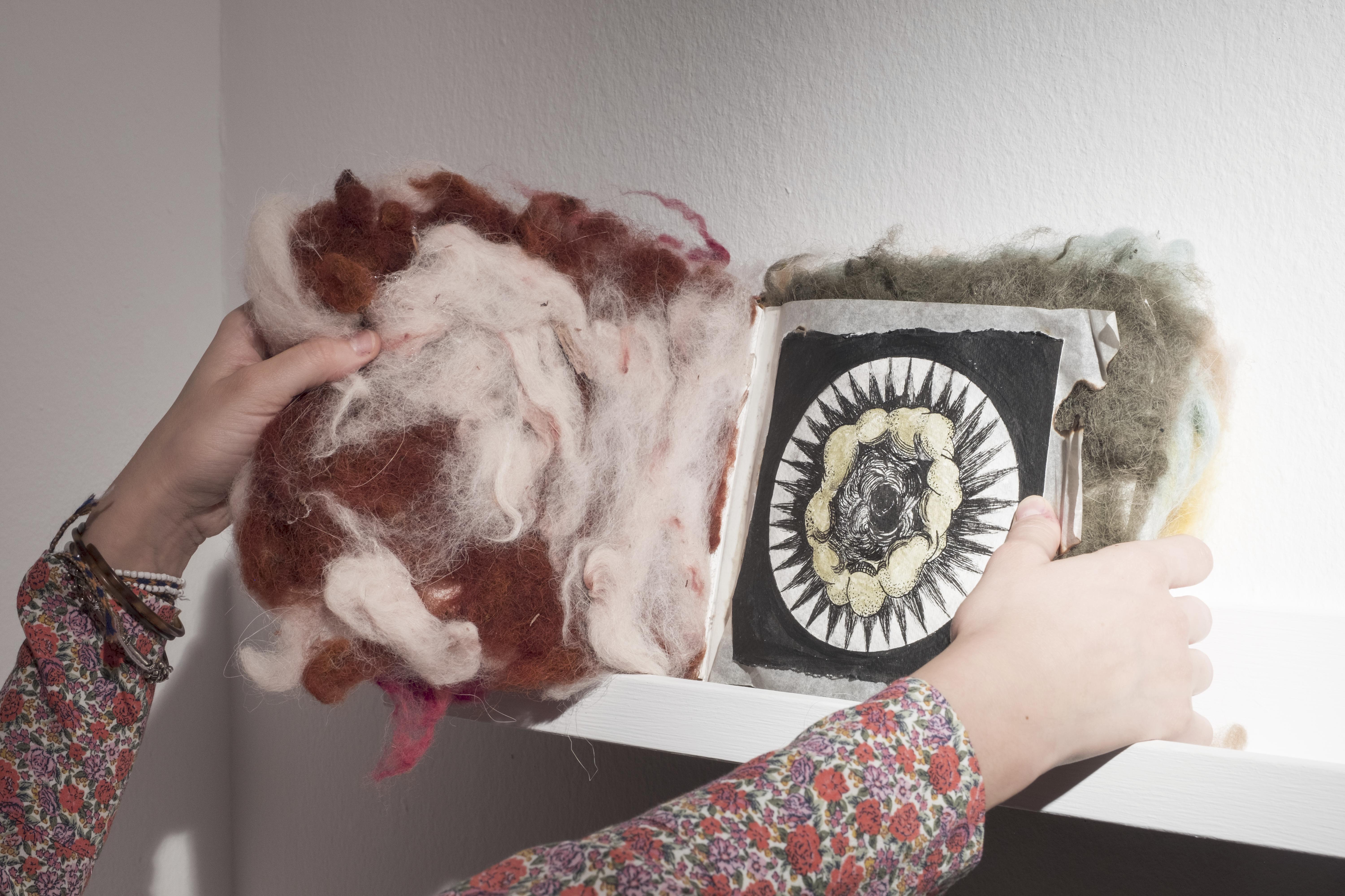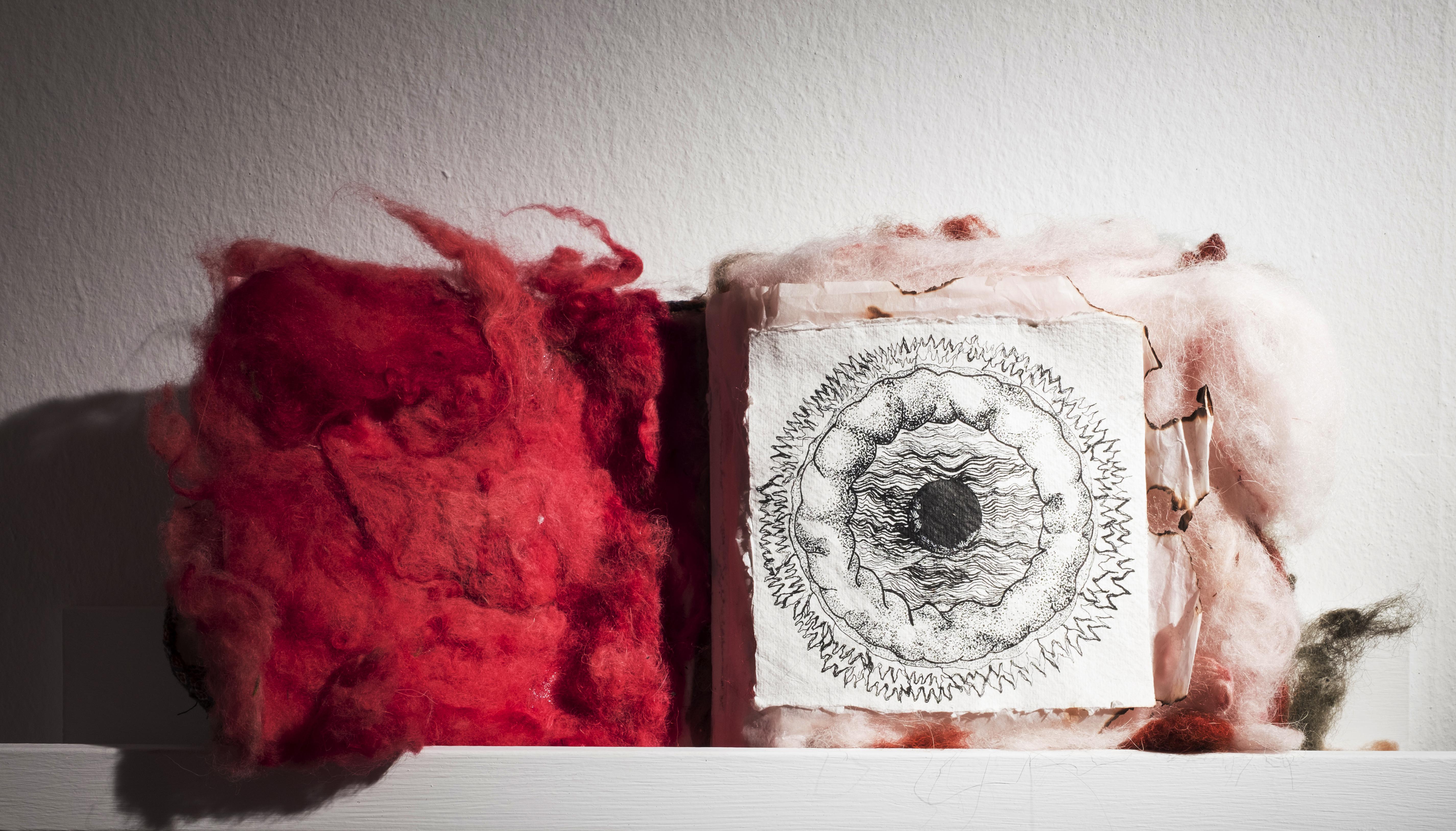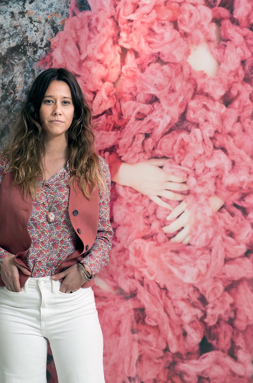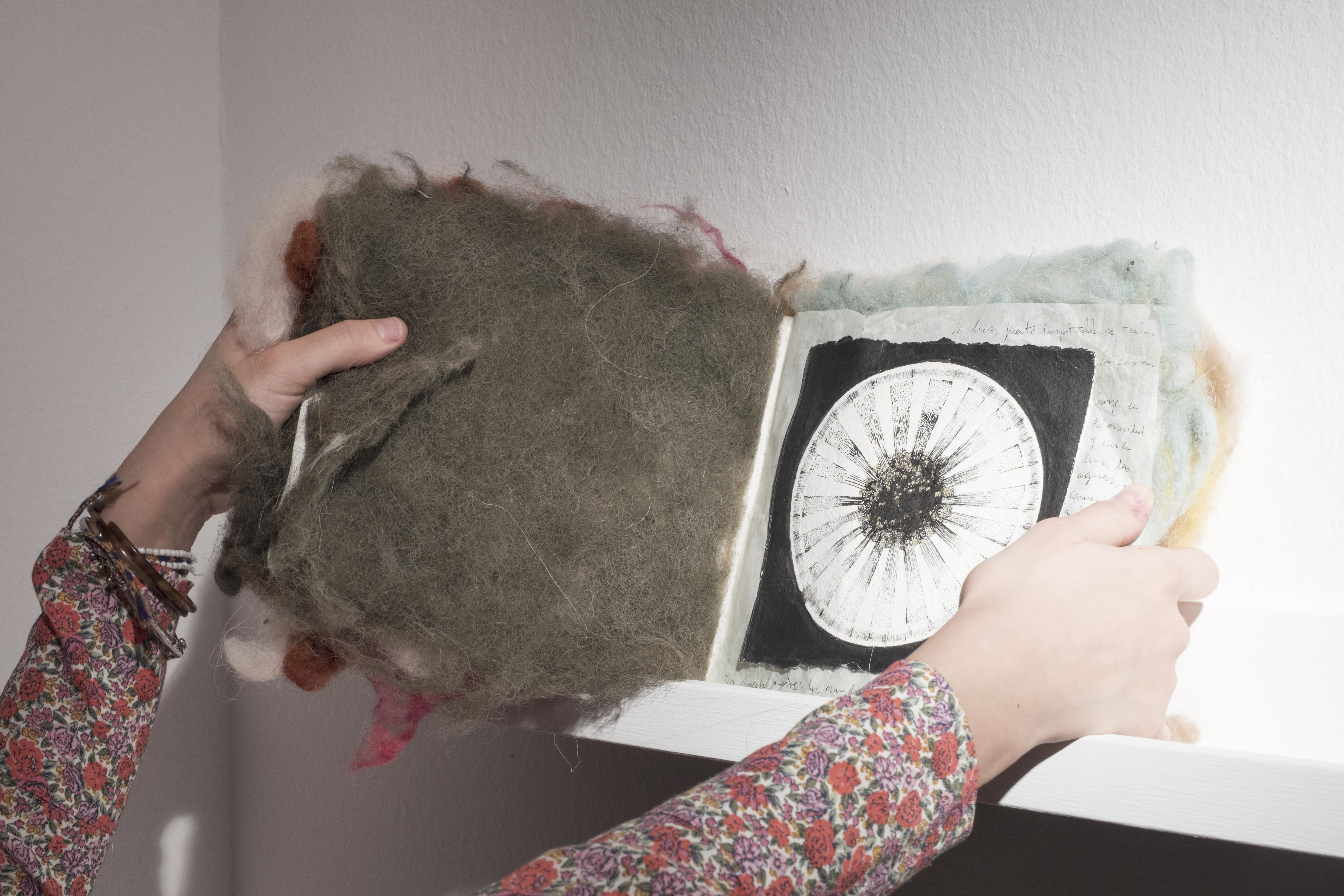 El empleo de la piel de alpaca teñida con un insecto como la cochinilla me ha servido para crear un nuevo tejido a mi cuerpo. Un florecer que produce una metamorfosis mágica de sanación, resurgiendo de los líquenes y el musgo, de las rocas agrietadas y el aire caliente que levanta remolinos de polvo y resiste a la tempestad. De este modo tematizo igualmente la preocupación por la pérdida de nuestros instintos y los ciclos vitales naturales, subsumidos por la cultura o por el ego y que llevan a un estado próximo a la destrucción.