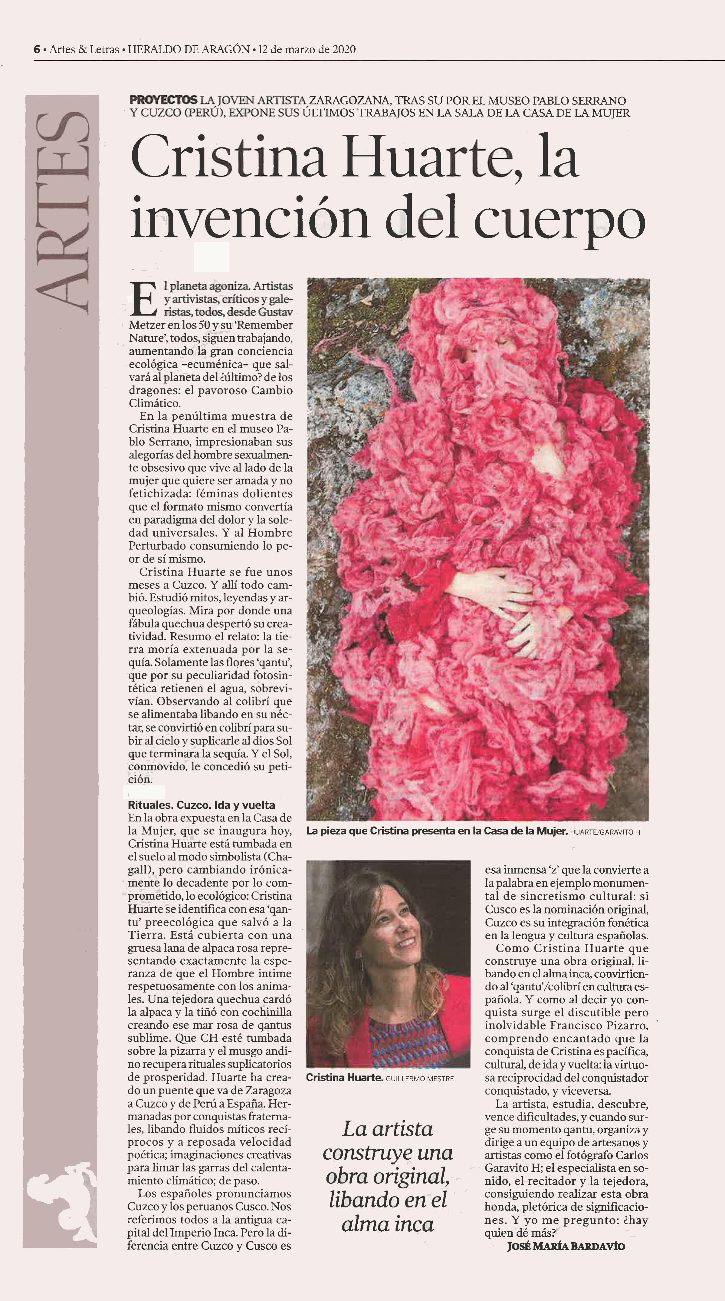 Qantu, Exposición de Cristina Huarte en la Sala Juana Francés. Qantu es el nombre de la flor sagrada de los incas del Perú y también el nombre que toma el nuevo trabajo artístico de la zaragozana Cristina Huarte tras su estancia en la residencia