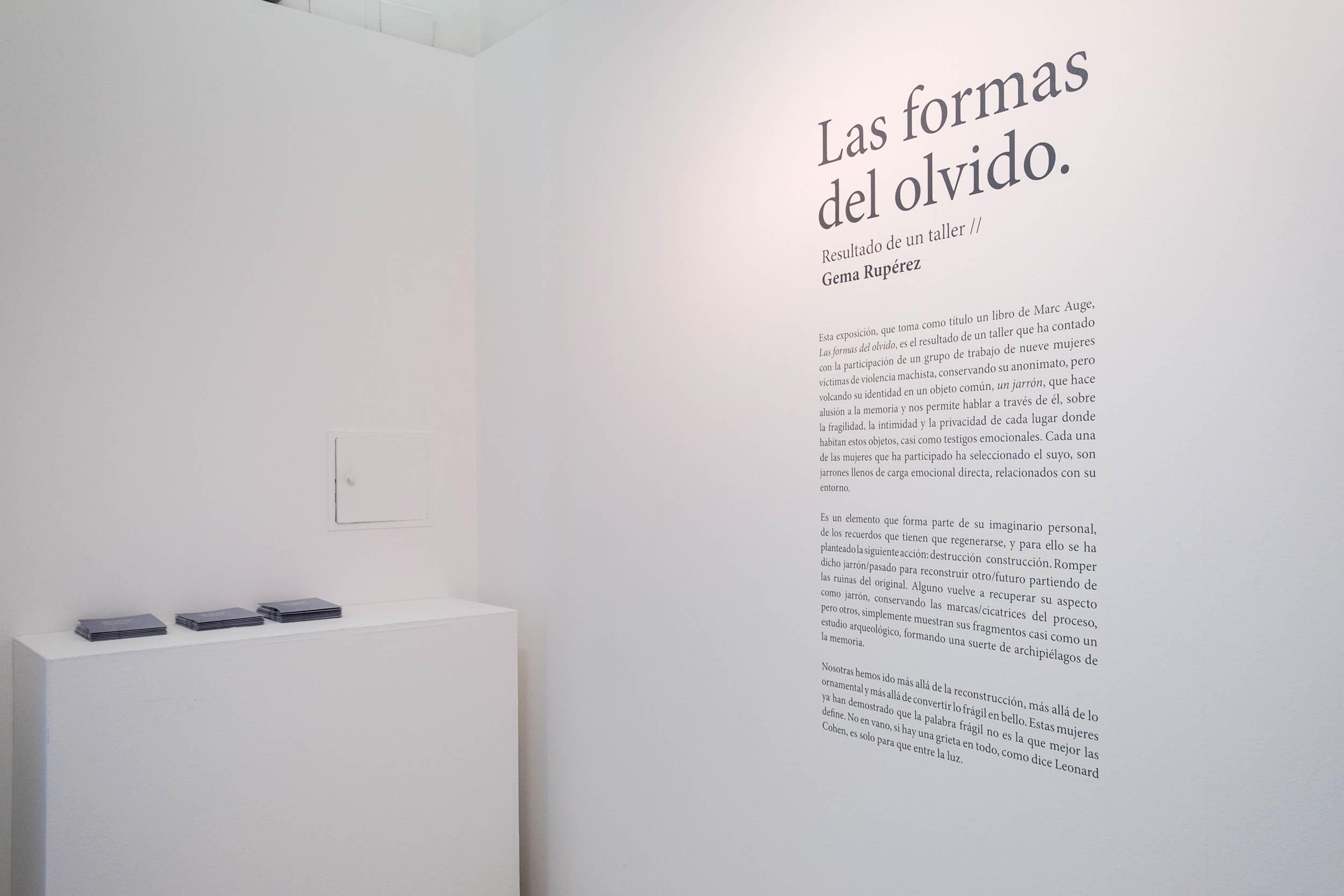 Esta exposición, que toma como título un libro de Marc Augé, Las formas del olvido, es el resultado de un taller que ha contado con la participación de un grupo de trabajo de nueve mujeres víctimas de violencia machista, conservando su anonimato, pero volcando su identidad en un objeto común, un jarrón, que hace alusión a la memoria y nos permite hablar a través de él, sobre la fragilidad, la intimidad y la privacidad de cada lugar donde habitan estos objetos, casi como testigos emocionales. Cada una de las mujeres que ha participado ha seleccionado el suyo, son jarrones llenos de carga emocional directa, relacionados con su entorno.