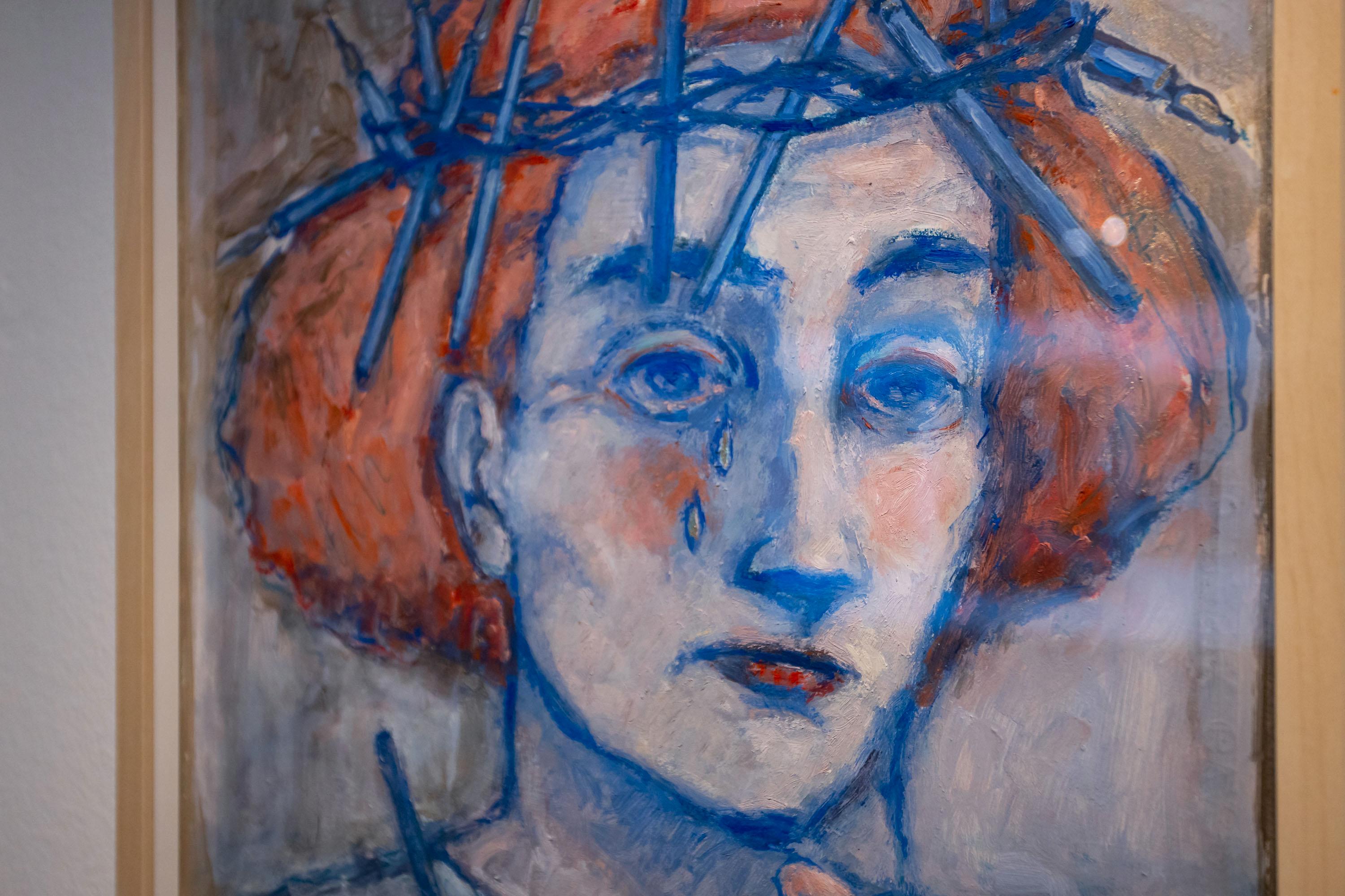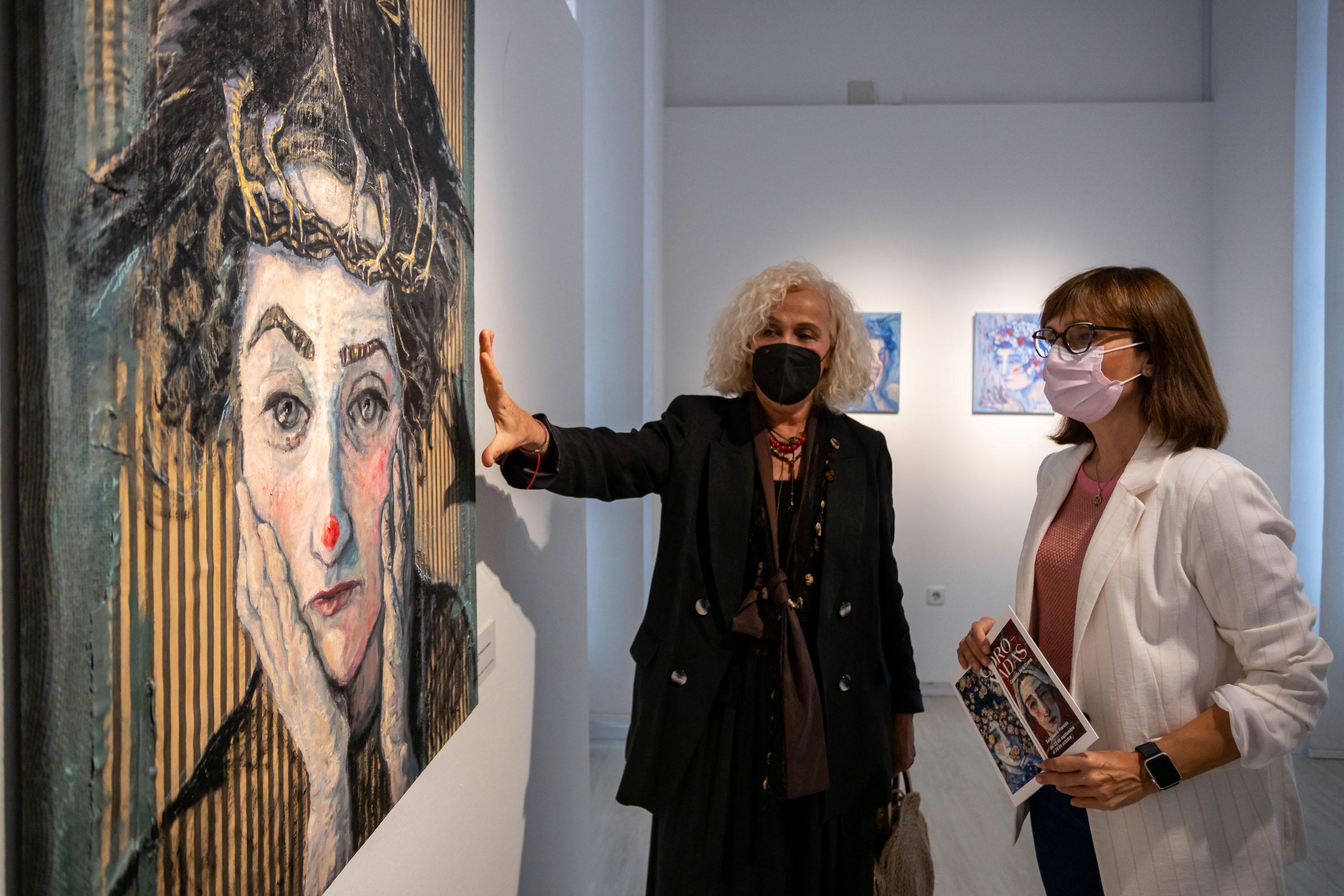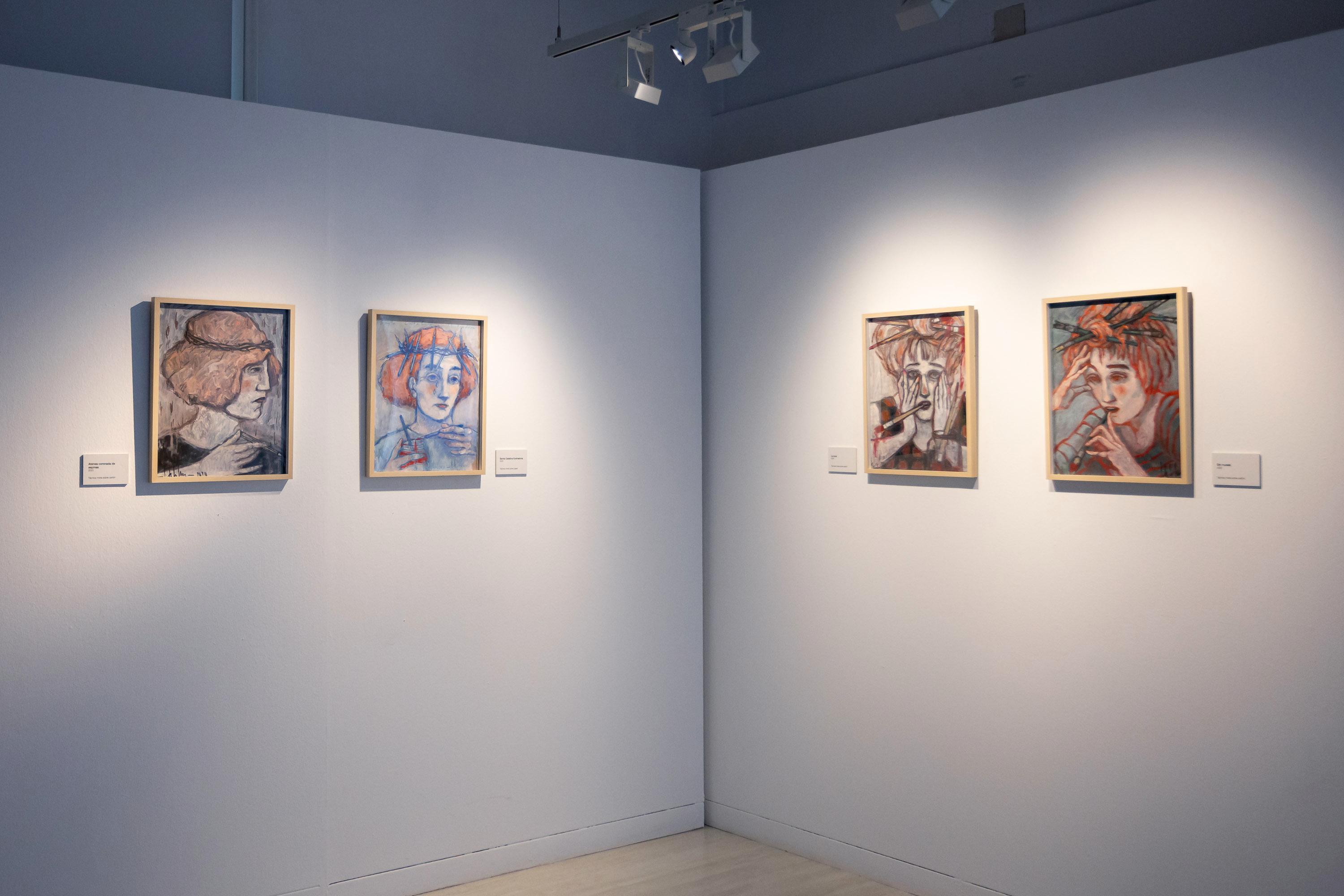 Las piezas muestran cabezas femeninas coronadas, rostros y manos en primer plano característico de su obra, y elementos diversos, animales u objetos, que conforman las coronas. En total, más de veinte obras componen esta muestra en la que aparecen cabezas femeninas coronadas por cuervos, libros, pinceles y hasta calaveras