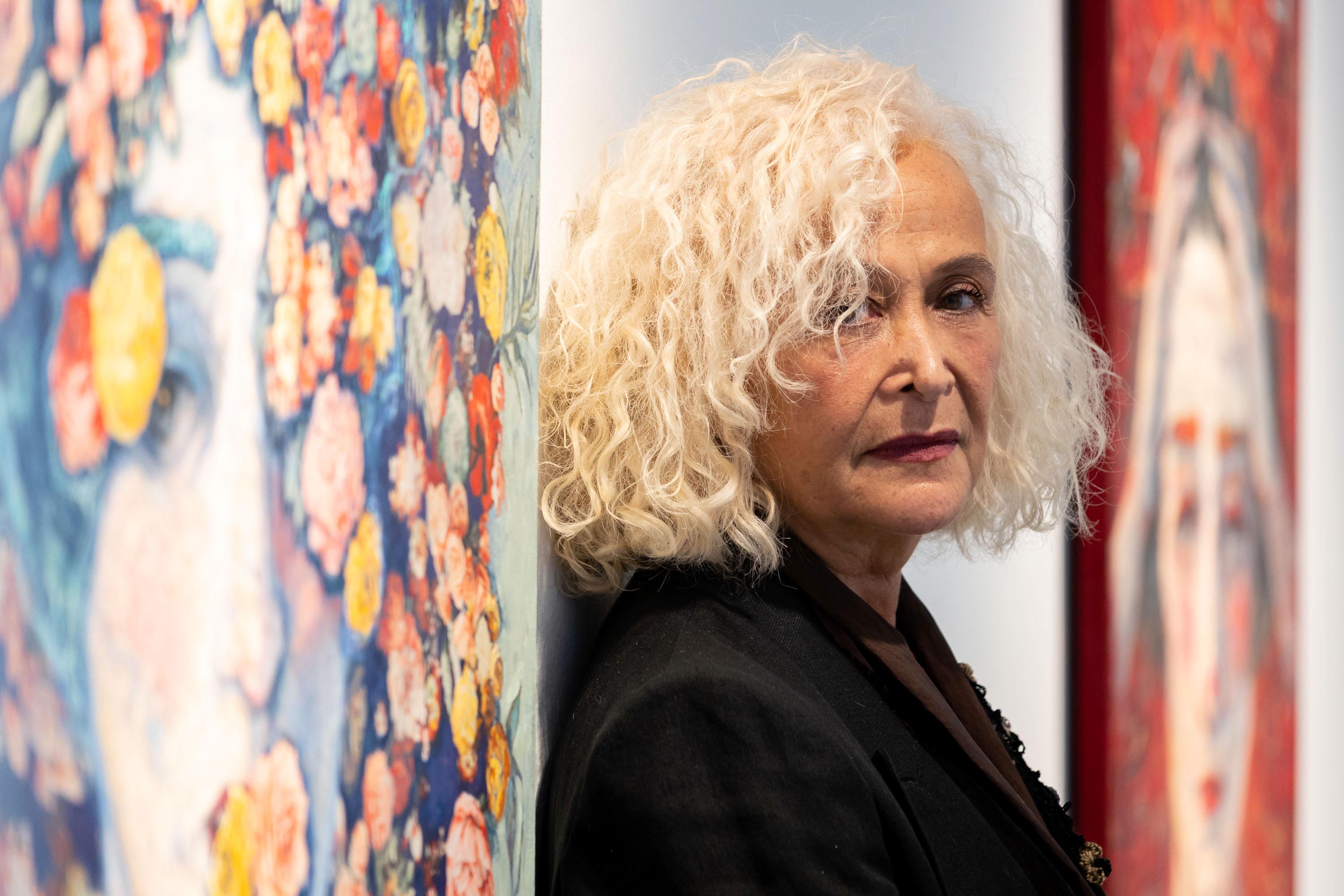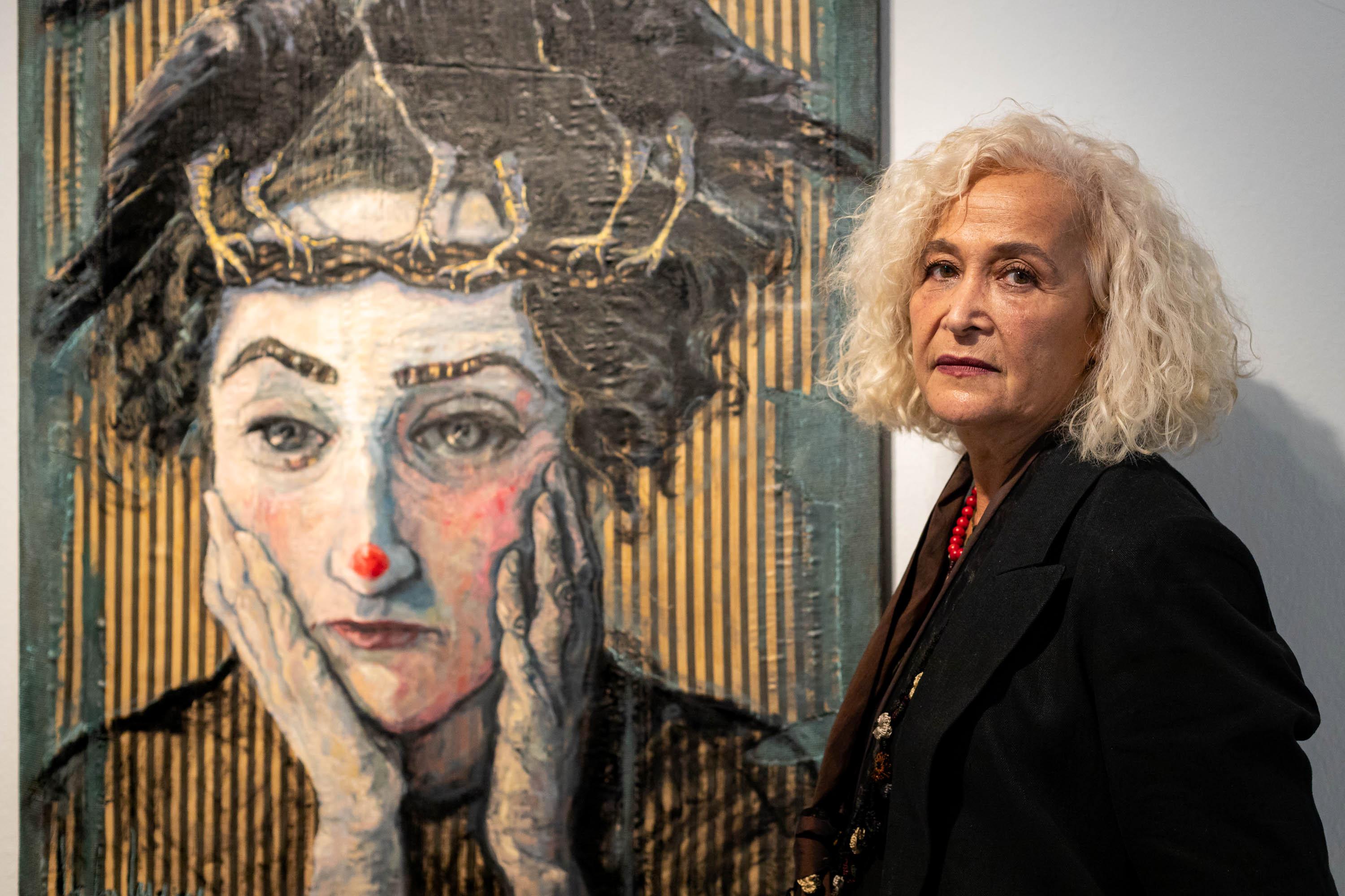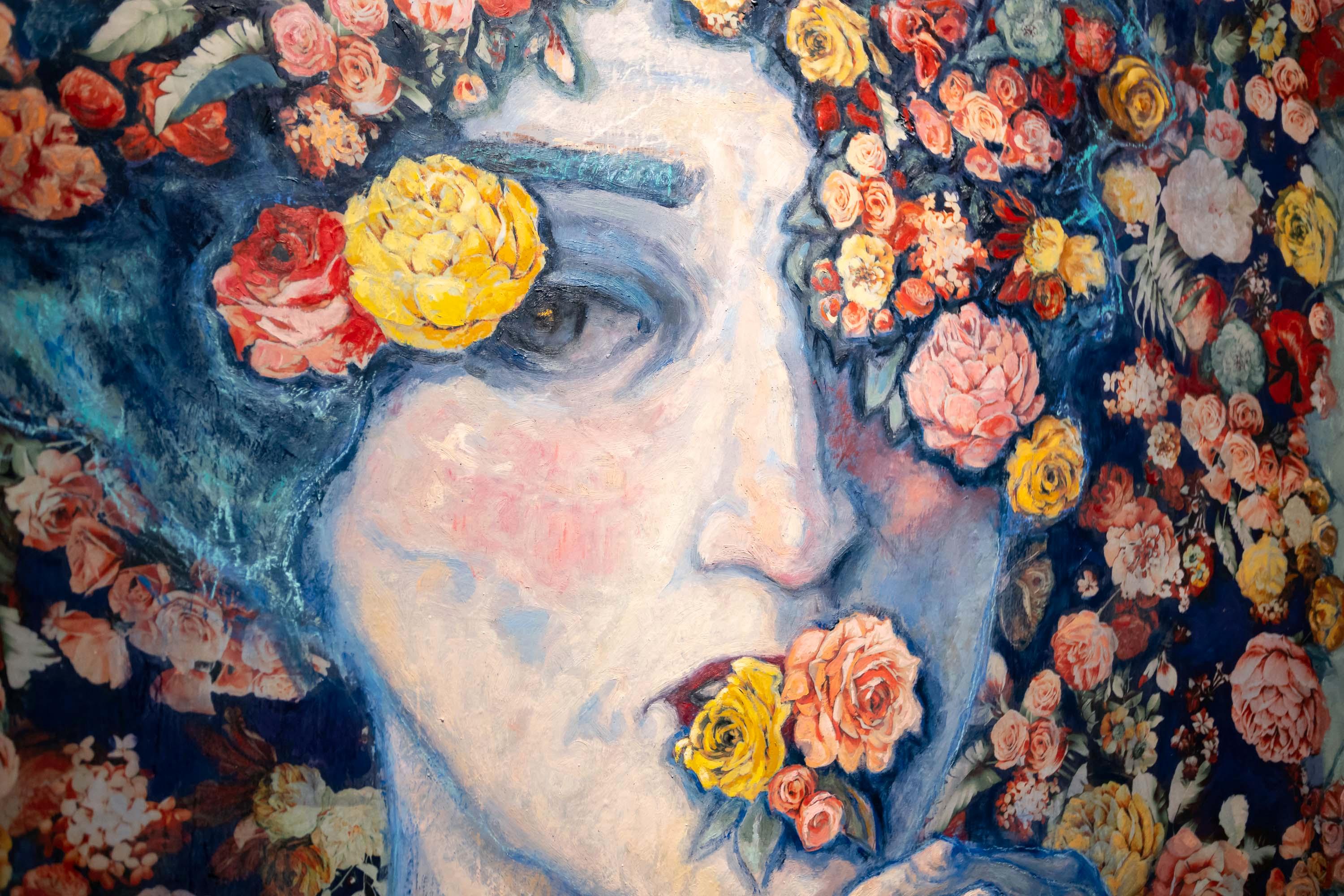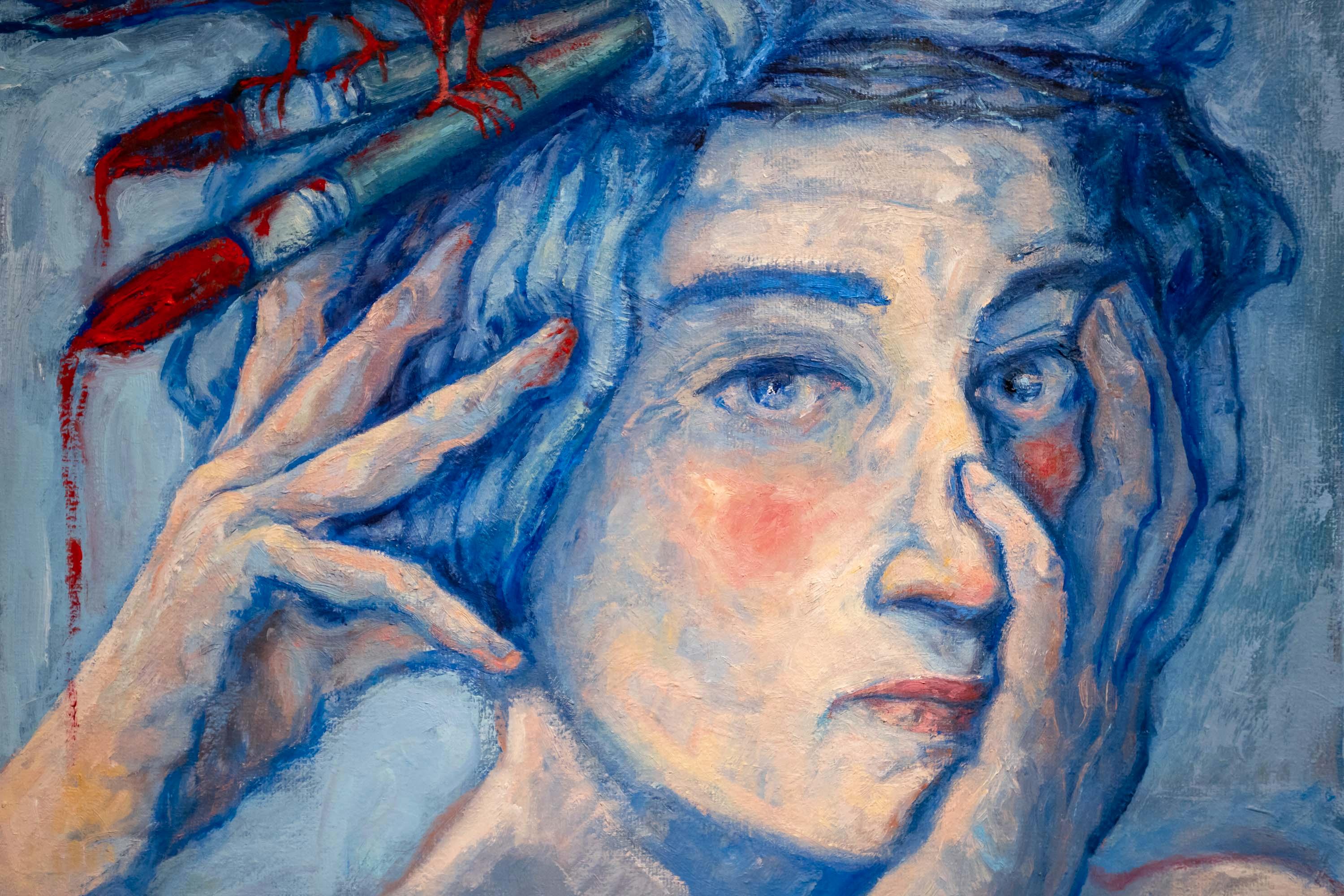 Las piezas muestran cabezas femeninas coronadas, rostros y manos en primer plano característico de su obra, y elementos diversos, animales u objetos, que conforman las coronas. En total, más de veinte obras componen esta muestra en la que aparecen cabezas femeninas coronadas por cuervos, libros, pinceles y hasta calaveras