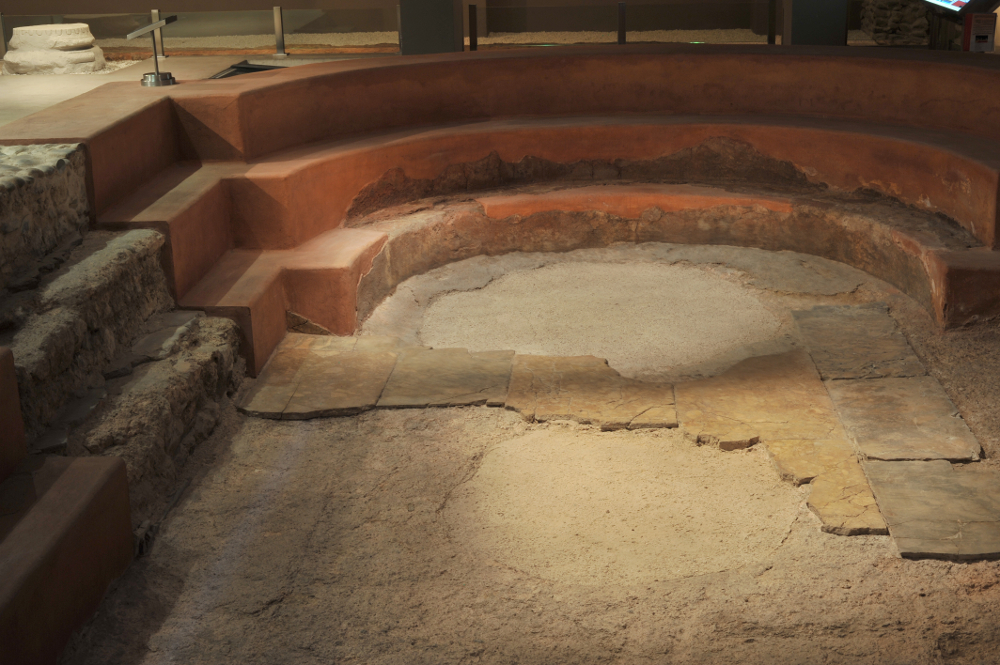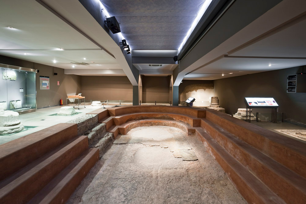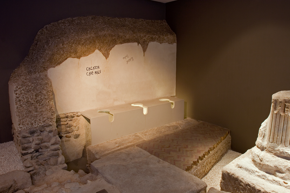 Aprovechando el pequeño espacio existente, junto a los restos de las letrinas y la piscina se instalaron paneles explicativos, una maqueta y una gran vitrina con placas de mármol que habían decorado el pórtico romano y reproducciones de objetos de adorno corporal o útiles de aseo e higiene que los habitantes de Caesaraugusta pudieron utilizar en sus estancias en las termas.