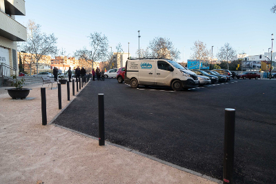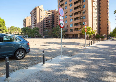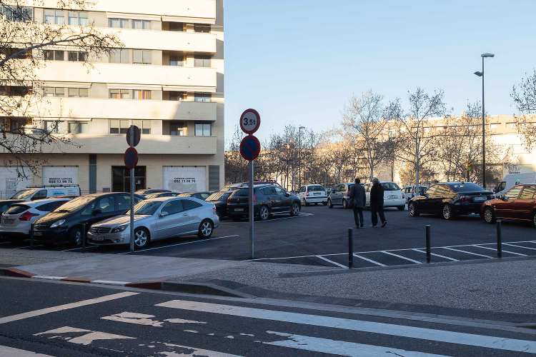 Se ha adecuado el suelo con terminación en asfalto y pintado de las líneas de aparcamiento. Se crean un total de 21 plazas de aparcamiento, con colocación de bolardos separando el aparcamiento de la acera. Se han ejecutado dos badenes, uno de entrada y otro de salida, con señales de tráfico y rebaje de acera.
